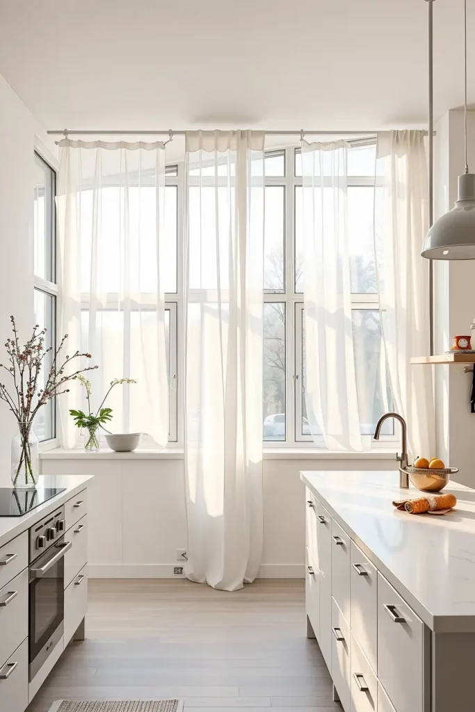 To scatter light across the room, I prefer the surfaces that of bouncing itself, such as the white walls, shiny tiles, or even white countertops. There is sparse window dressing: no window dressing, or sheer linen. In case there is a privacy concern, or there is a need to provide shades, or frosted panels will work, but they will not dim the space. Response can further enhance light by use of reflective hardware, e.g. stainless steel or brushed nickel.