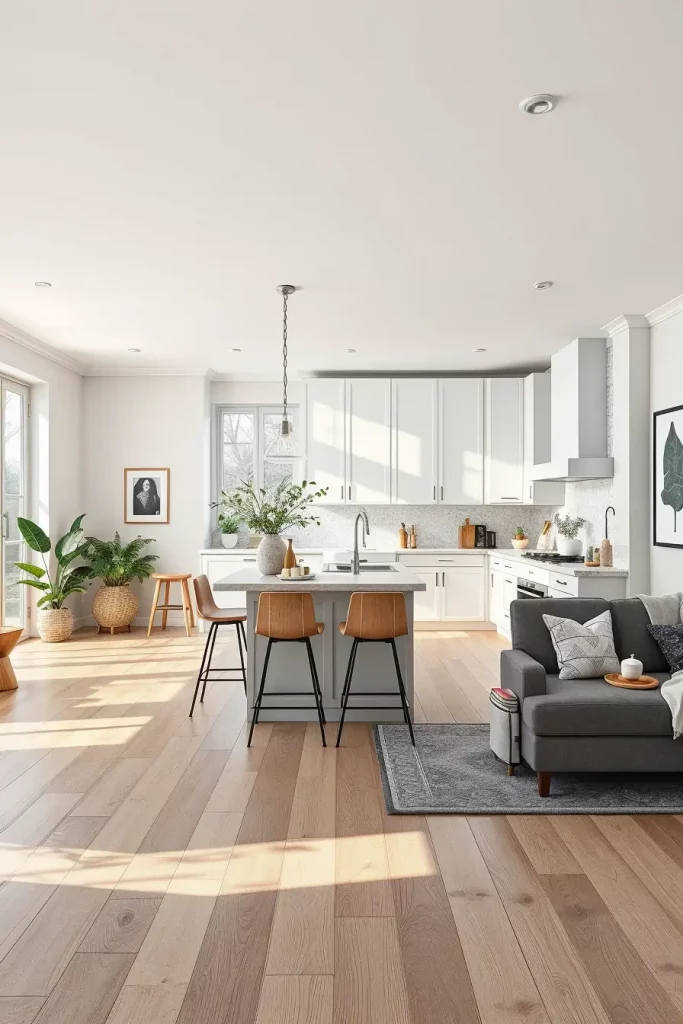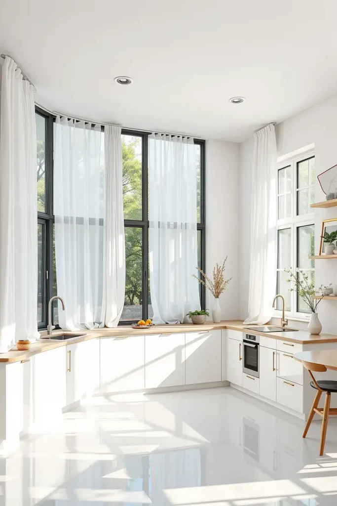 The decor and furniture should include open shelving, light wood bar stools and slim white cabinets. I will rather include pendant lights with white or metallic colored trim to keep the minimalistic character. Large windows are to be lightly covered, or not covered at all and might use sheer linen with its soft Nordic undertone. Pale wood flooring finishes the whole and provides the warm, natural balance.