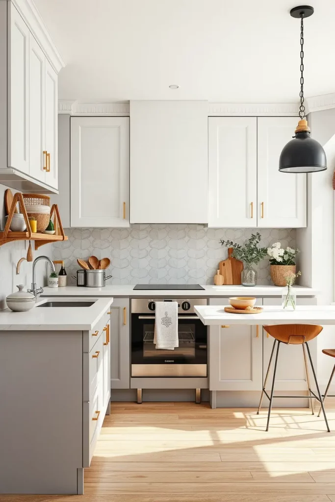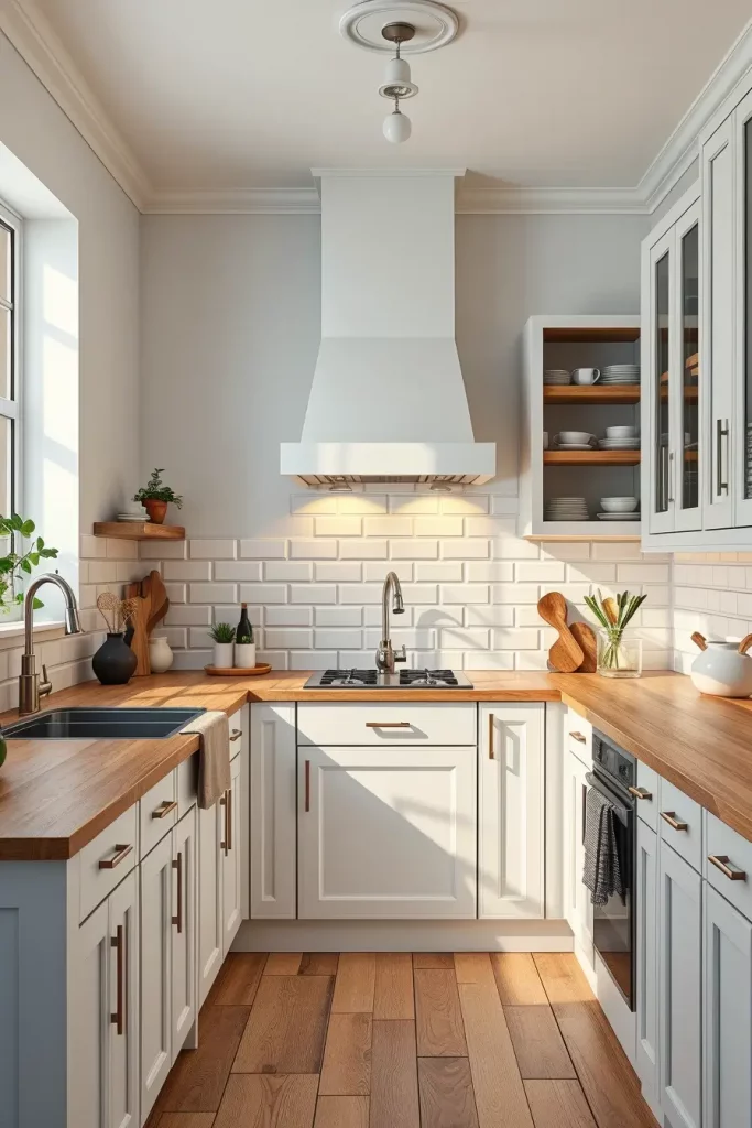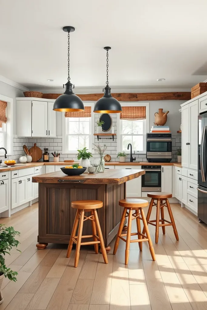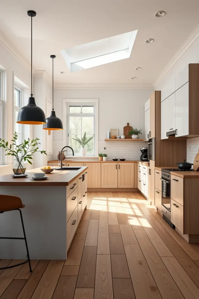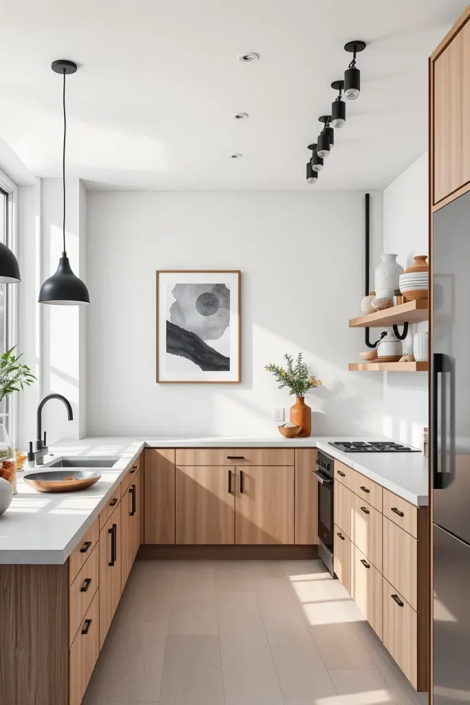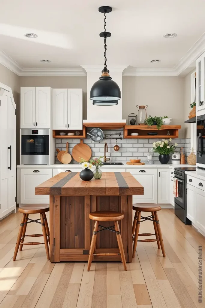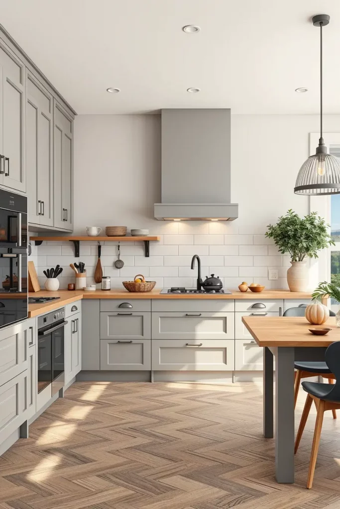 I like to begin with a foundation of white or light gray cabinets, matte black hardware and light wood floors. Next, I will add rustic details, such as a wooden island countertop made of reclaimed wood, wooden stools of vintage construction. In a contemporary mix, I could include brushed black drop lighting or a stylish, handleless fridge. All these elements are compared without contradictions due to the Scandinavian base that is simple and clean.