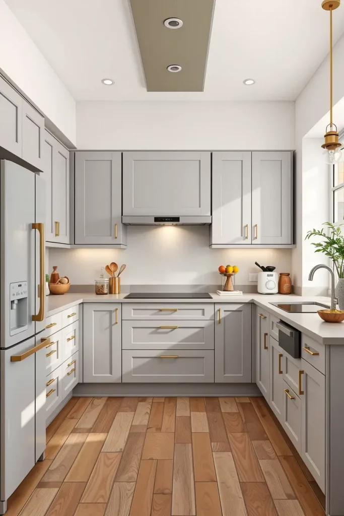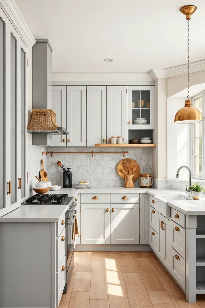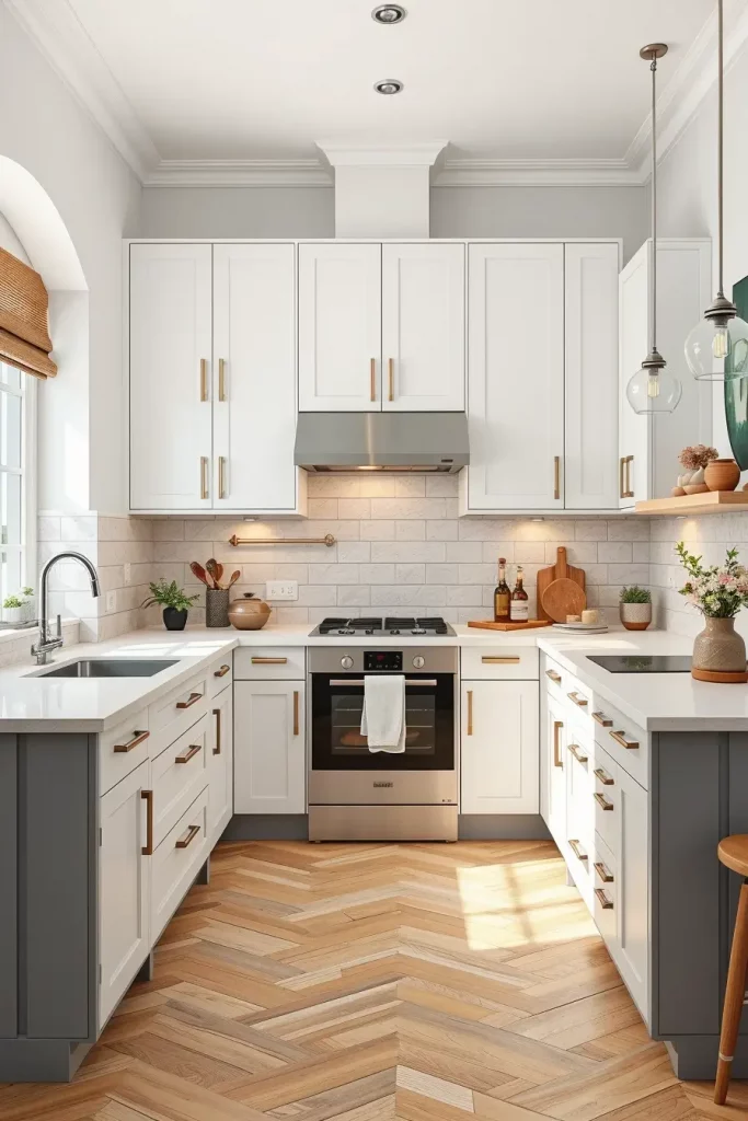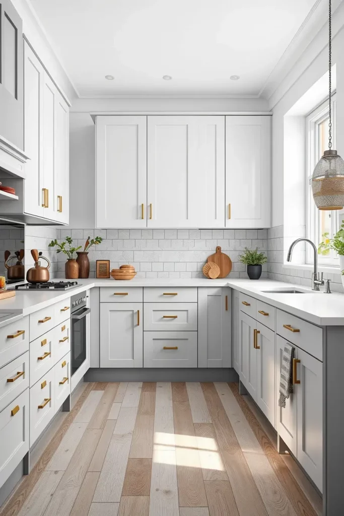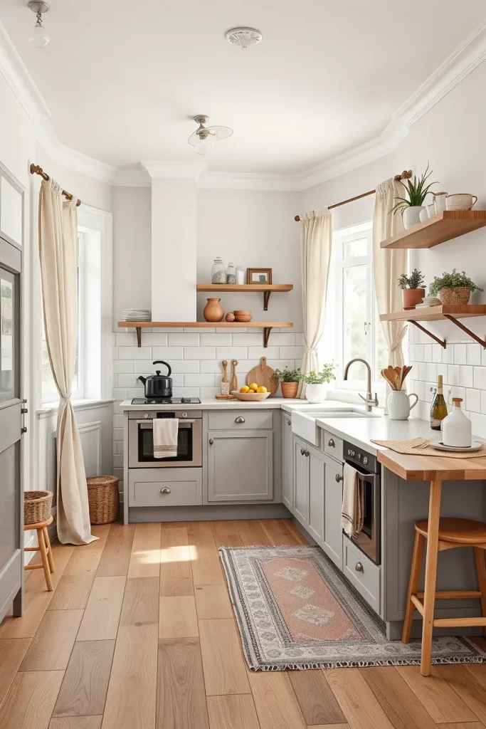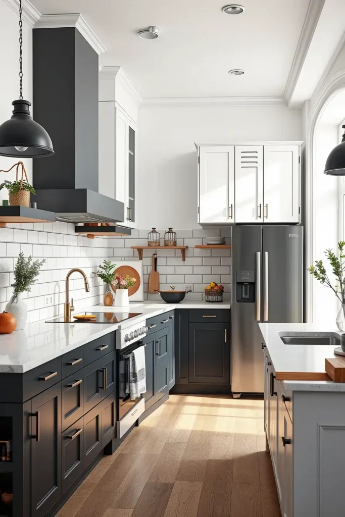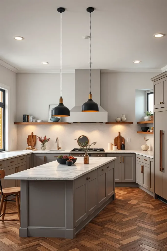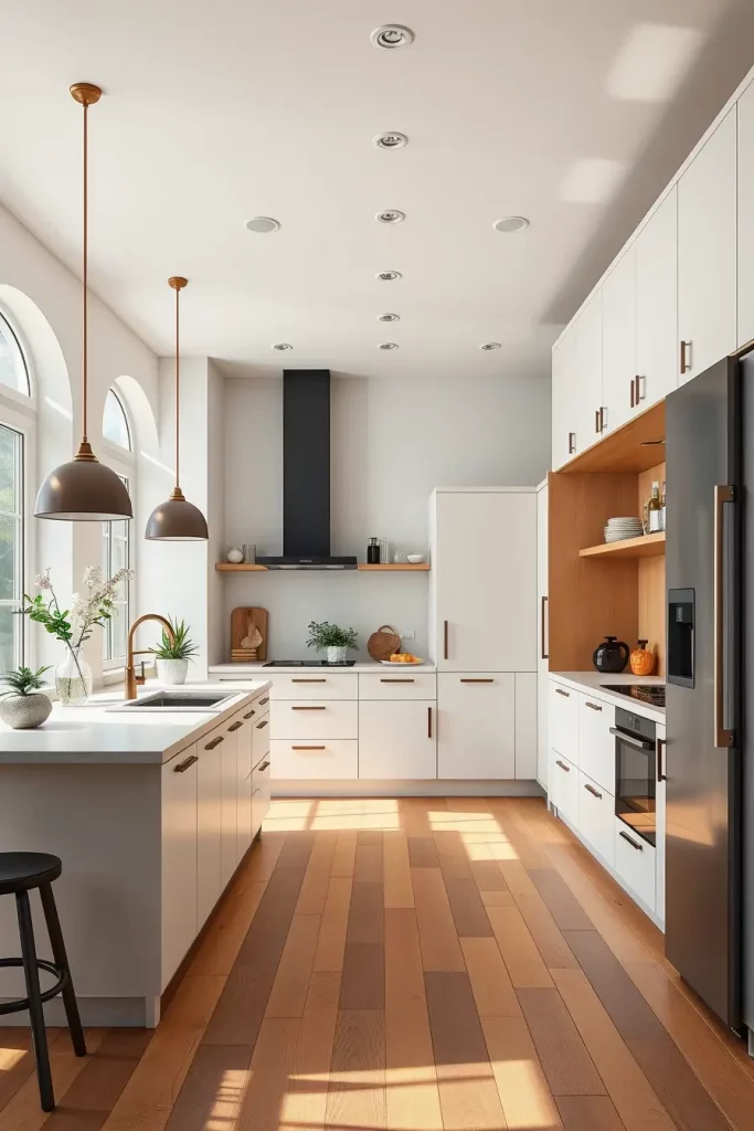 I like to begin with a foundation of white or light gray cabinets, matte black hardware and light wood floors. Next, I will add rustic details, such as a wooden island countertop made of reclaimed wood, wooden stools of vintage construction. In a contemporary mix, I could include brushed black drop lighting or a stylish, handleless fridge. All these elements are compared without contradictions due to the Scandinavian base that is simple and clean.