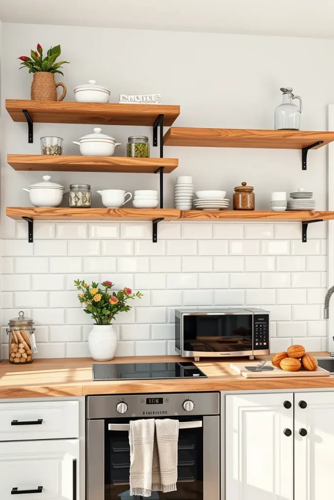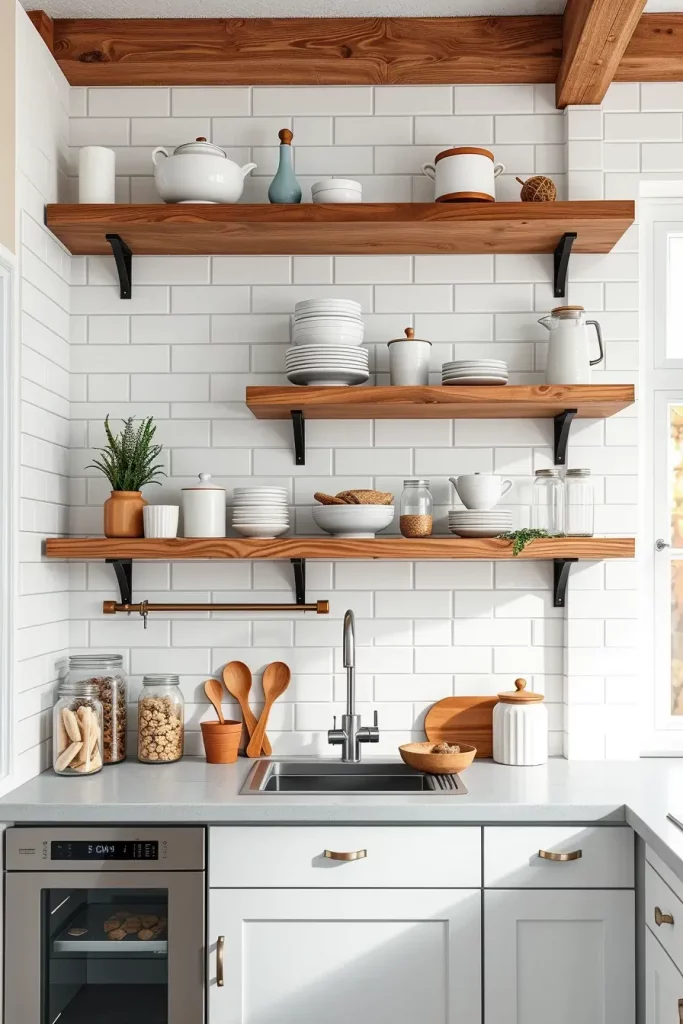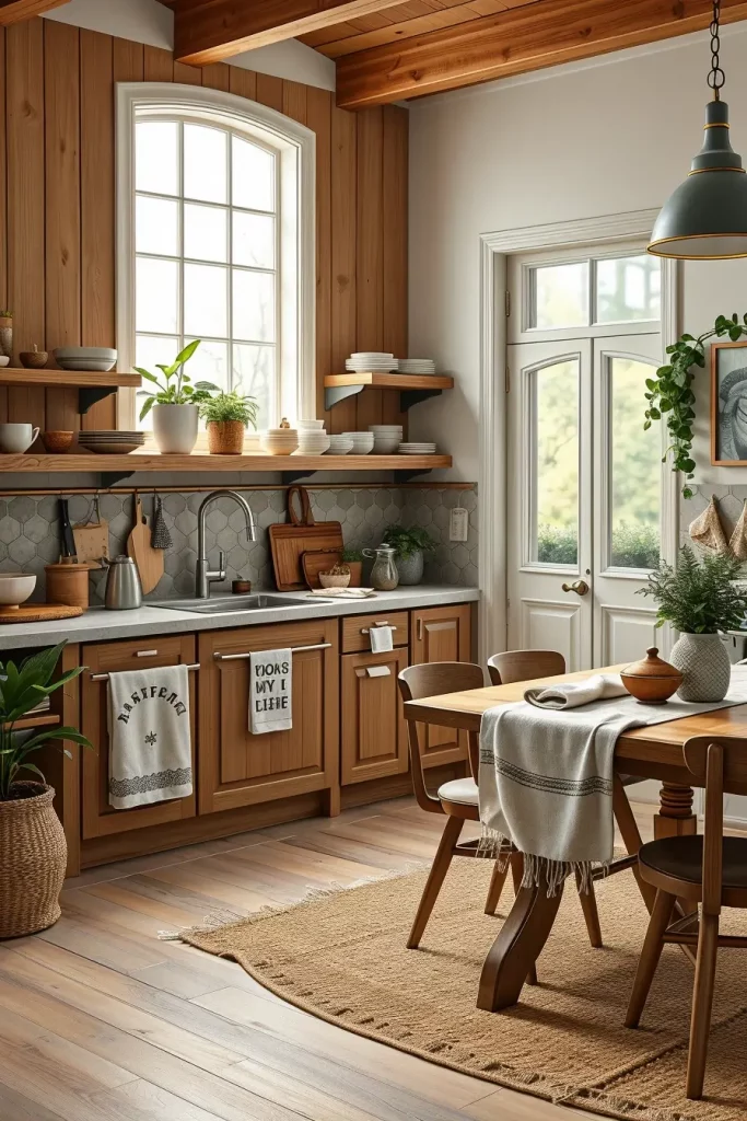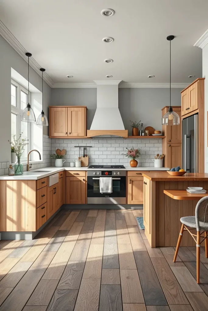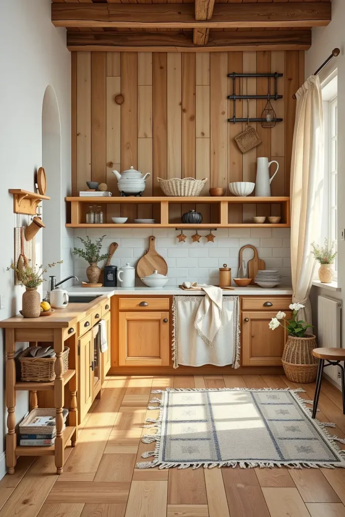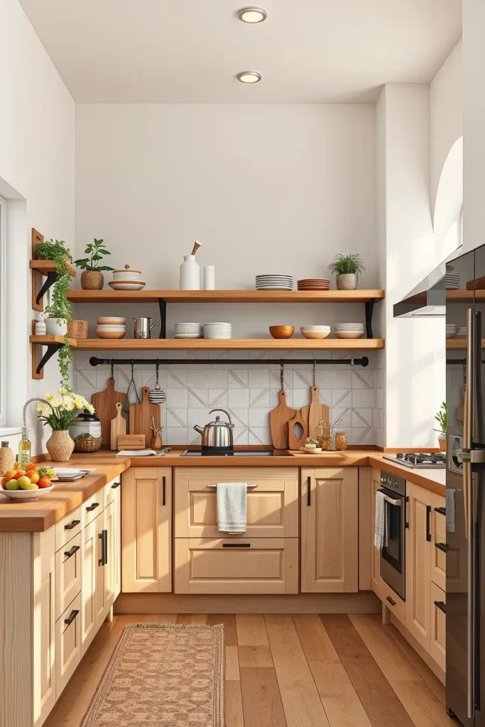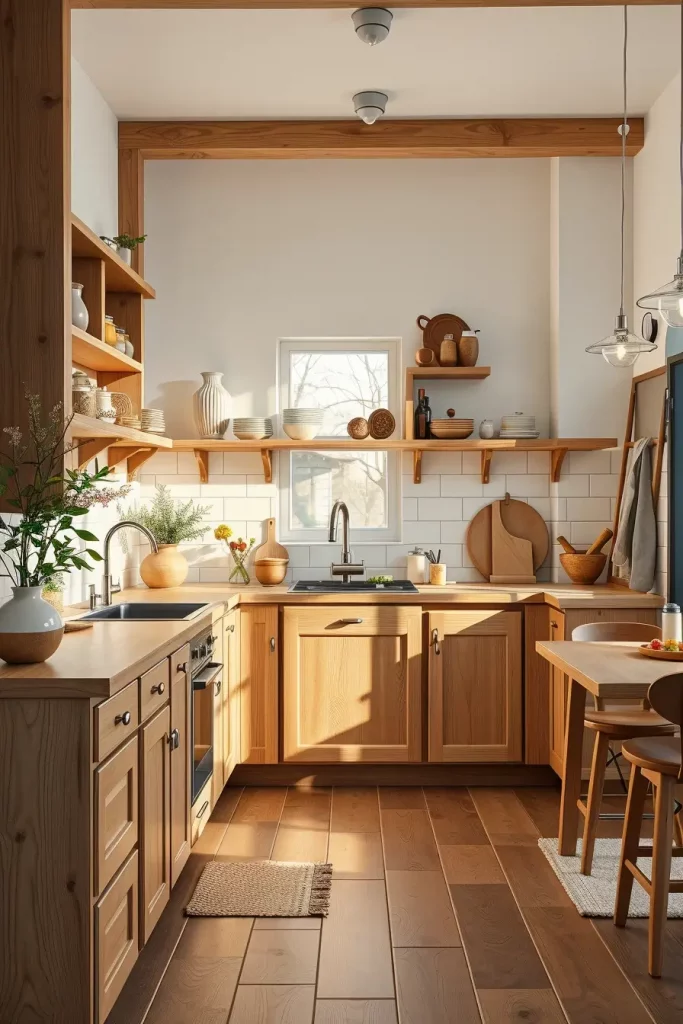 Having said that, wood looks great on countertops, dining stools, or even on feature walls, in particular in combination with white or grey base tones. As an example, one can find that butcher block island combined with white cabinets will look both vintage and contemporary. Neutral dishware and greenery look well with open shelving in light-colored wooden materials, which also gives an organic touch.