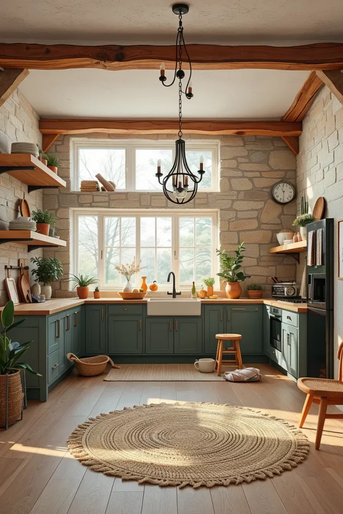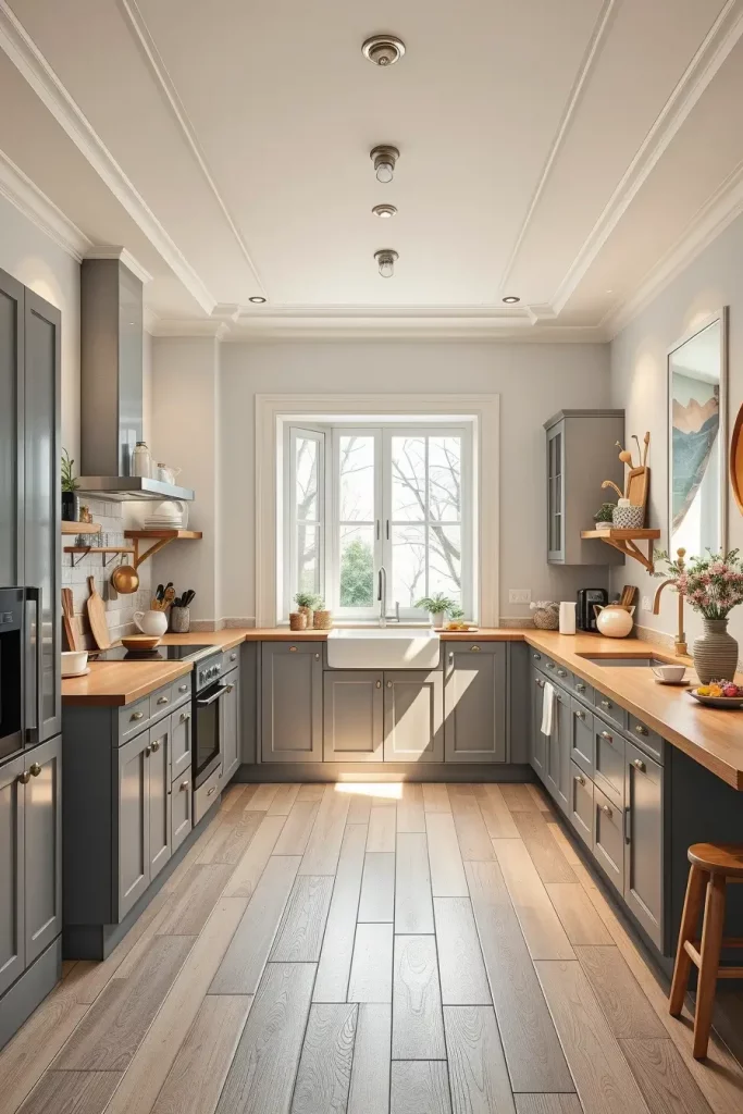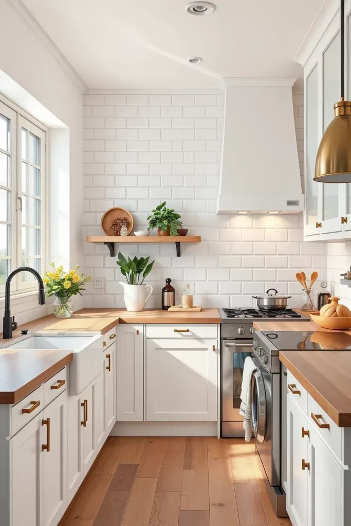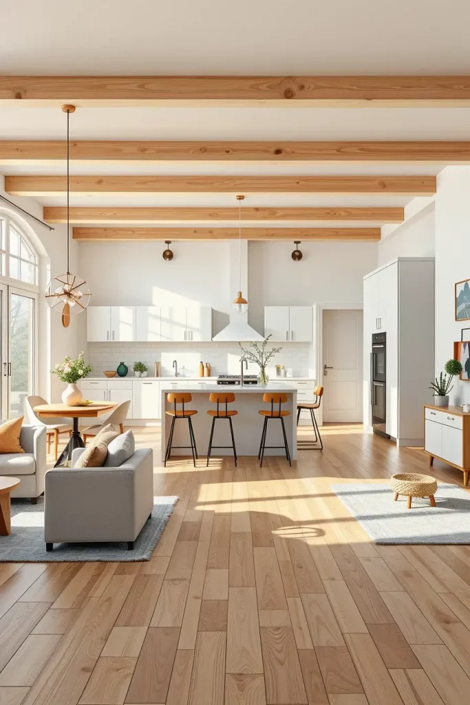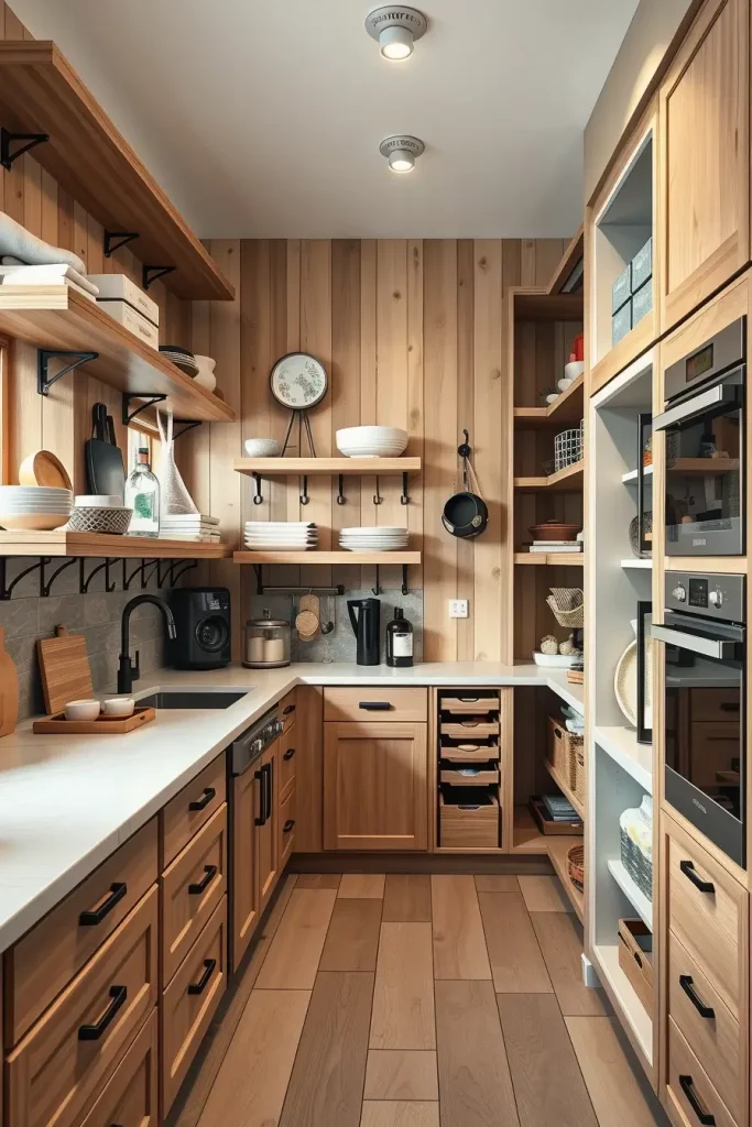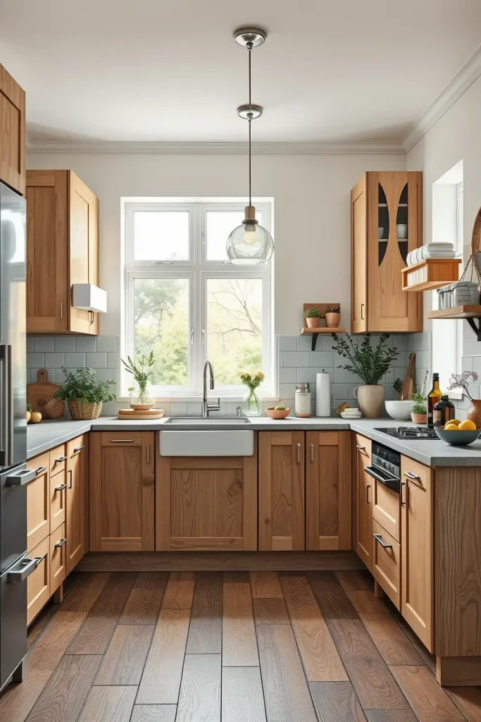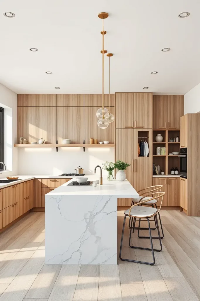 Having said that, wood looks great on countertops, dining stools, or even on feature walls, in particular in combination with white or grey base tones. As an example, one can find that butcher block island combined with white cabinets will look both vintage and contemporary. Neutral dishware and greenery look well with open shelving in light-colored wooden materials, which also gives an organic touch.