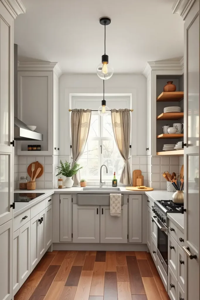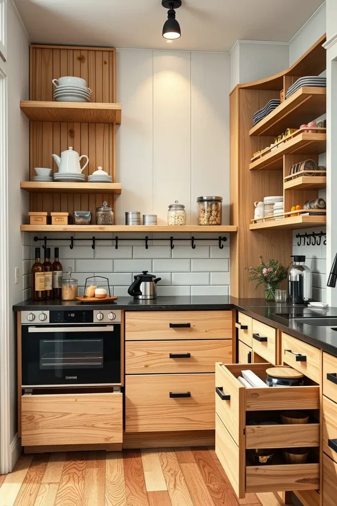 Some of the furniture in such kitchens comprises of small cabinetry, folding tables placed on walls, as well as small open shelving. The room appears less full with light tones, shiny objects, and not so many items. I tend to put up shelves for the dishes and pegboards to put the tools so that the counter will not be crowded. The most essential are corner carousels and drawer organizers to make right use of these tight spaces.
