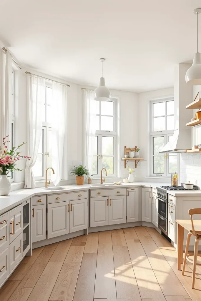 Making a light kitchen with a lot of space lies at the core of Scandinavian design. My usual starting point always consists of a neutral base (and that is mostly whites and soft greys) and combining it with abundant windows or skylights to welcome natural lights. Mirrors also contribute to the light-strewn feeling as can be seen in white tile backsplash or light countertops. It is the type of space which immediately seems larger and more positive.