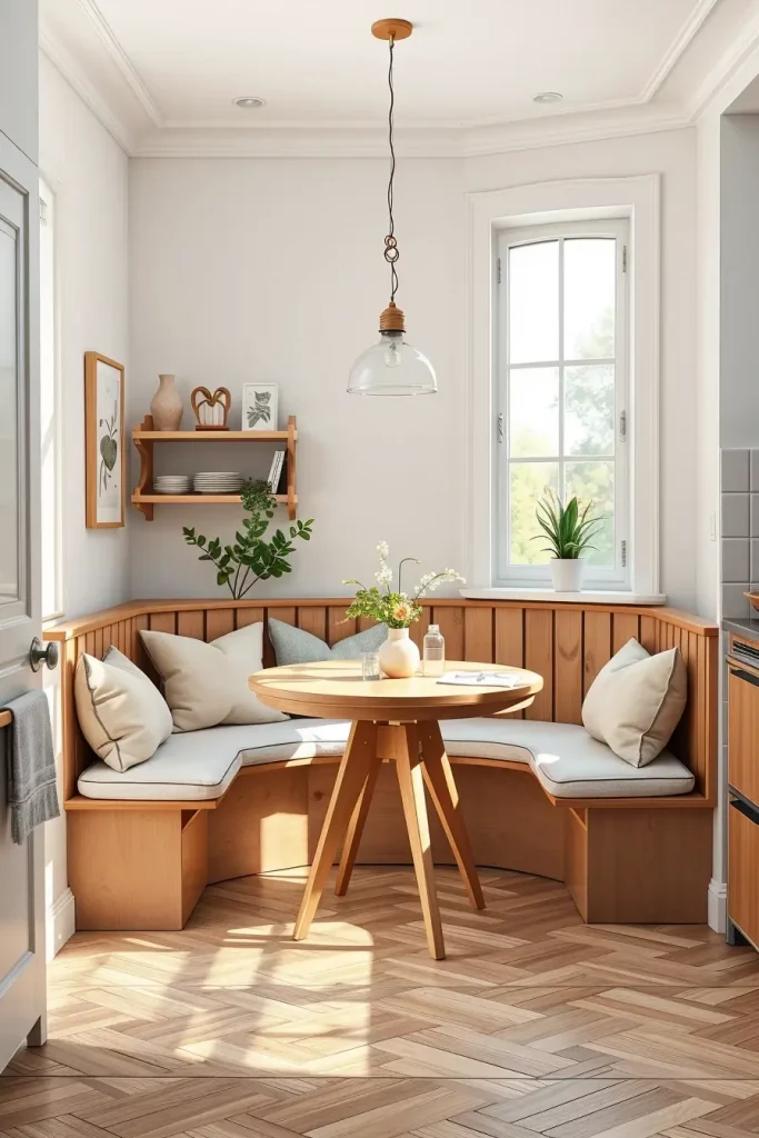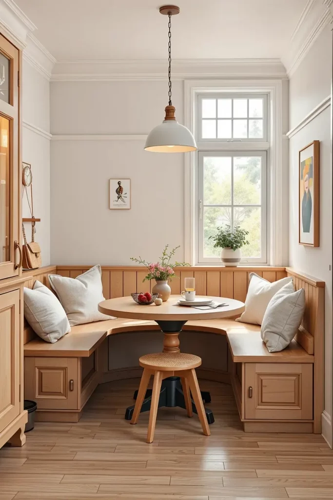 My favorite design is one of these nooks that have built-in bench seating that has been upholstered in linen or bowls. A wooden round table, together with classic wooden Scandinavian chairs such as the Wishbone or J39, are both functional and beautiful. Natural finished wood, sheepskin throws, and minimalistic pendant lights finish off the comfy picture.