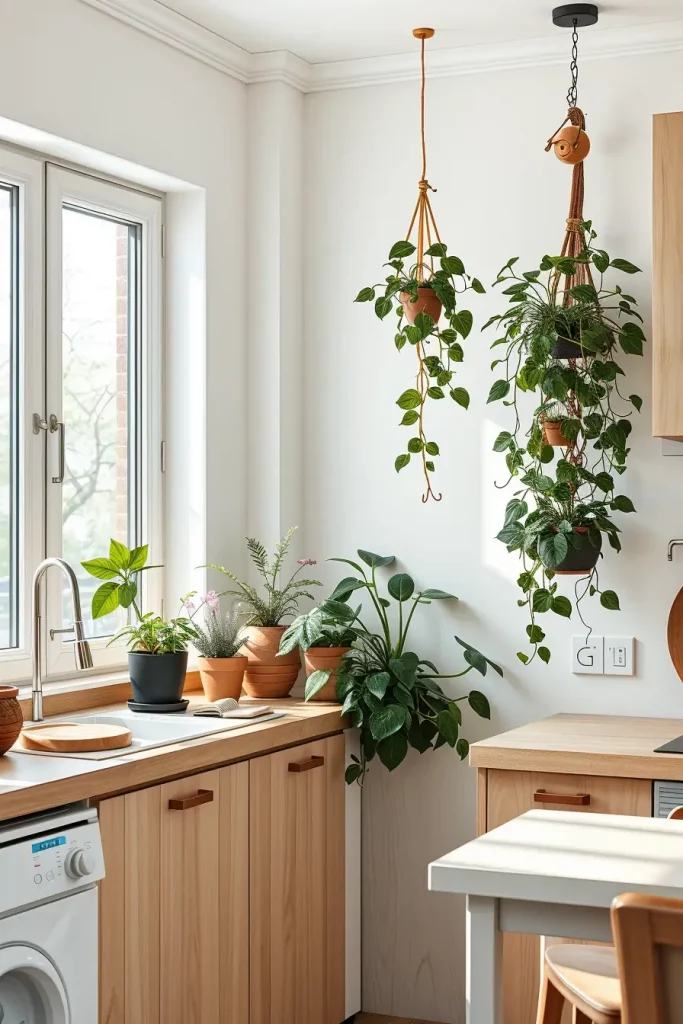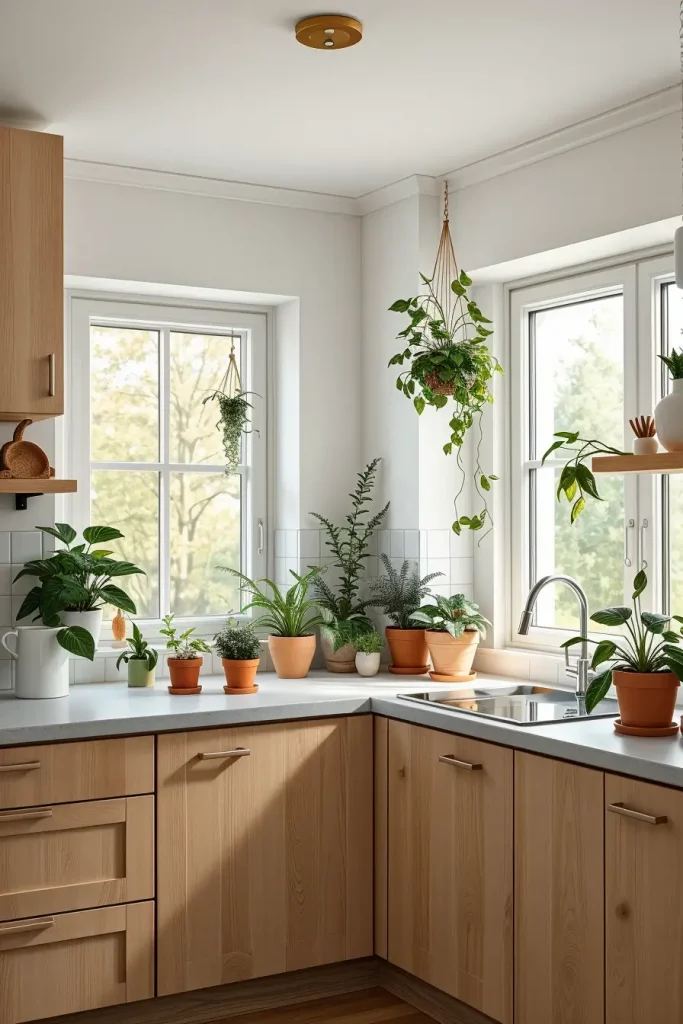 On windowsills I prefer to plant potted herbs such as rosemary or basil, or trailing ivy can be hung on open shelves. Great ones, on the other hand, such as rubber trees or fiddle-leaf figs, look fantastic in case you have an open space of the floor. Use simple planters in matte concrete or ceramics in order to preserve the minimalist style.