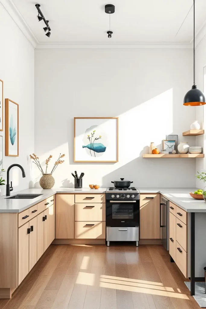 That kind of interior I involve the line drawings of muted tones or black-and-white photography in narrow wooden or black metal frames. Frequently one abstract print, or a sketched botany by a sketch-glass frame, suffices. They usually hang over a floating shelf or rested carelessly up on the wall to keep a casual atmosphere. The combination of simple artworks with gentle textures and light wood cabinets contributes to retaining the essence of Scandinavian-style aesthetics: light, balance and functionality.