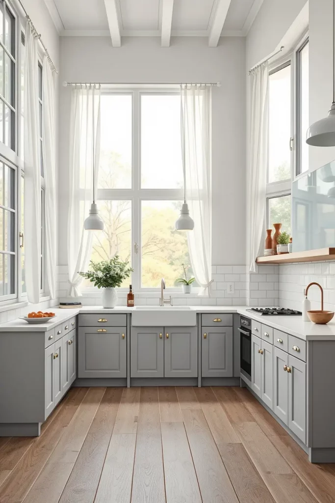 Their cabinetry is usually matte white or light grey whereas their counter tops are quartz in soft white and concrete shades. Walls are covered with light colors- even chalky off-whites to give out a three dimensional feel to walls. I prefer contrasting them with wood or metal finishes, which are natural. Such minor detail as beige linen curtains or greige dish towels also create a certain harmony.