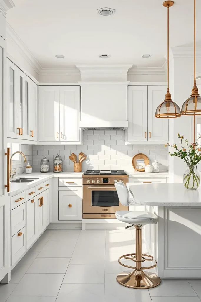 Common elements are cabinets made of matte white materials, white quartz or marble countertops and white ceramic tile backsplashes. I prefer combining them with a range of integrated appliances and unsophisticated hardware possibly in brushed metal or black to set off subtle contrast. The whites are made complete by white pendant lights and white bar stools.