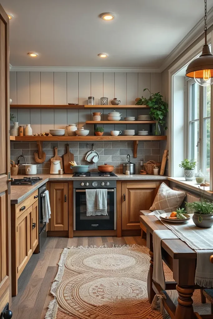 I never limit myself to warm wood colors usually of oak or beech and juxtapose them with soft textures such as wool seat cushions or linen running tablecloths. The dishes can be changed to the windowsill herbs in the pots, bowls on an open shelf, or a woven basket with produce. There is also dimmable hangings above the island or the dining table helping to create an evening feel.