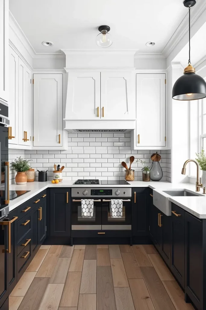 When it comes to design, I tend to advise matte black lower cabinets with whites uppers or walls, which form a stable component at the bottom and a light, fluffy one in the top. Even the black accents such as pendant lighting, bar stools or framed windows give it a structure and elegance. White subway tiles or quartz countertops will add a sharper contrast and make the scheme even more monochromatic. The break in contrast can be achieved by light wood floor which will also be warming without deviating the Nordic theme.