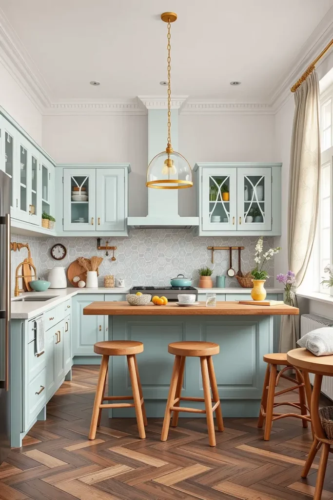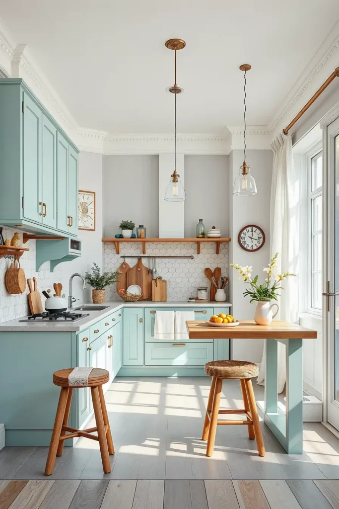 To pull this off, I use the pastel color in the lower cabinet or the kitchen islands but I maintain a neutral tone in the upper parts and walls. To retain that trademark ethereal style, backsplashes are made out of light mosaic tiles, pastel enameled kettles or dishes, and pale linen curtains. Real wood goes well with pastels, and therefore, I incorporate it into the shelving or dining tables.