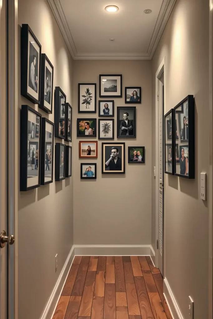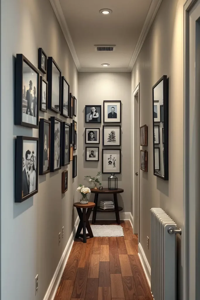 I usually keep small hallways looking nice by using a similar color scheme throughout. If you use a basic gray or beige color on your walls, you can build on the texture without giving the room a busy feel. Using this approach makes a room feel bigger and more connected.