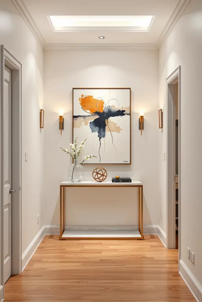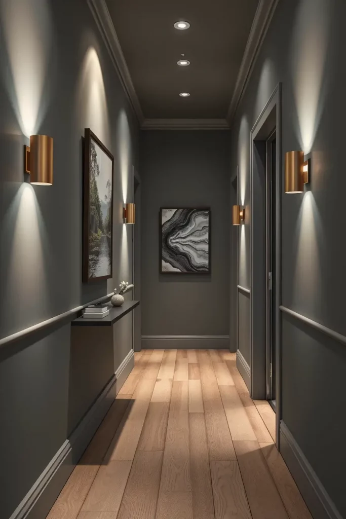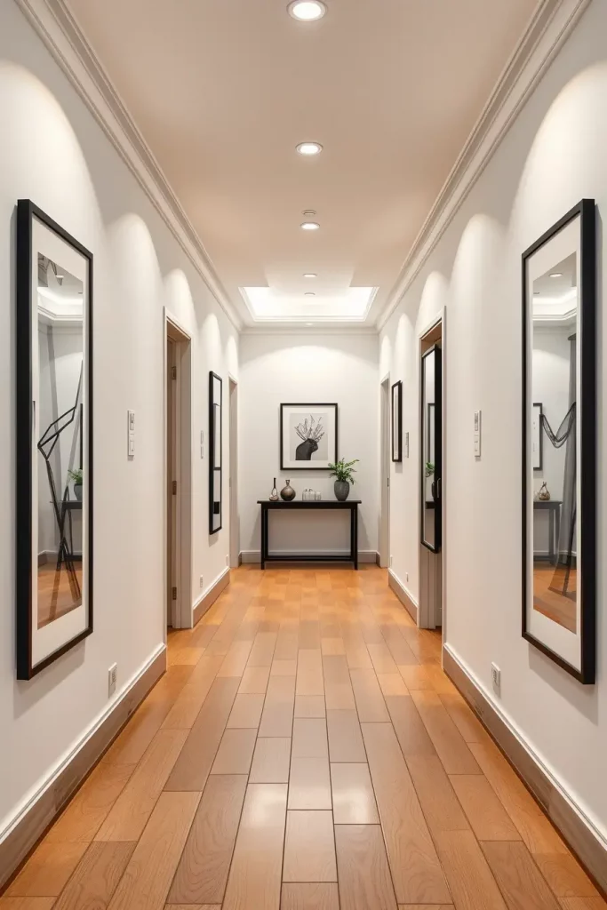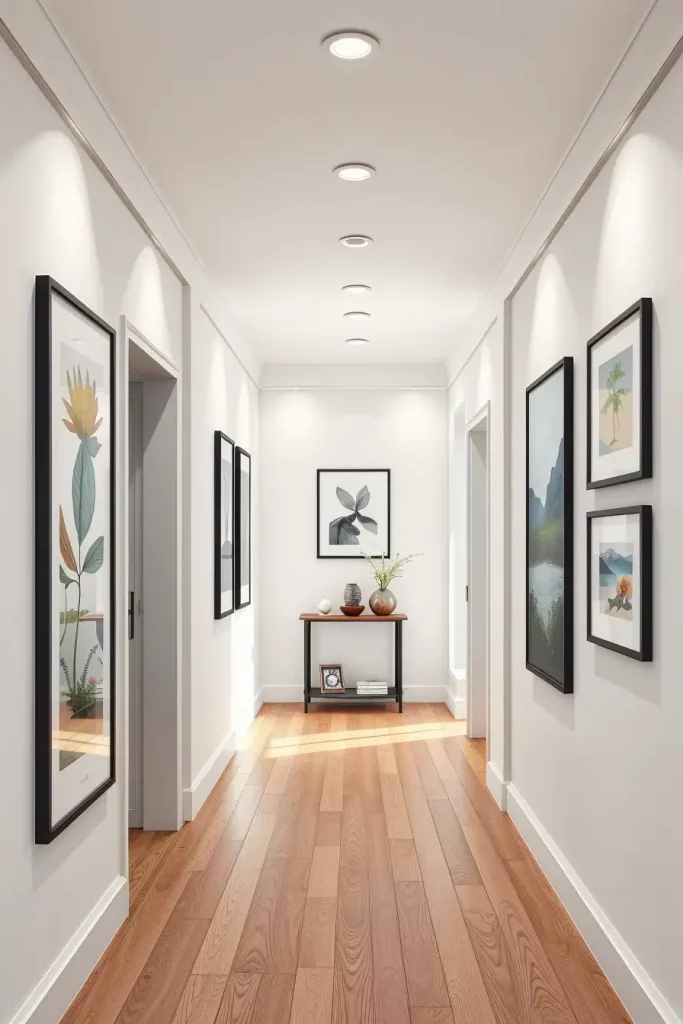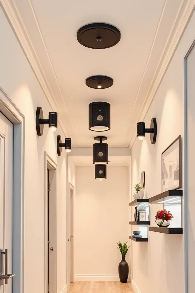 I find that flush-mounted ceiling lights and slim track lighting create a modern style. They light up the entire hallway without taking up space. They are great for highlighting your home or artwork and for adding more warmth to your surroundings. Putting LED strip lights below a console or shelf in the hallway gives a nice touch of light to the lower parts.