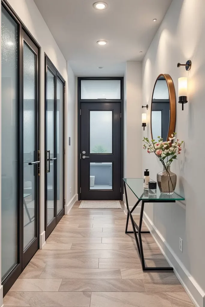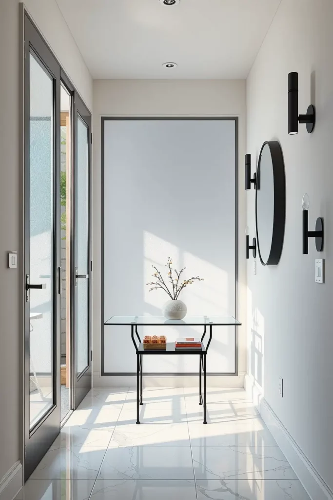 I think a nice glass console table goes well with this design. It doesn’t stand out visually and doesn’t need to add bulk to the area. Match this with a frameless glass mirror along with glass wall sconces. If a hallway adjoins a room, use a half-glass partition to let in daylight. Going for black or gold minimal frames helps your pictures look fresh and clean.