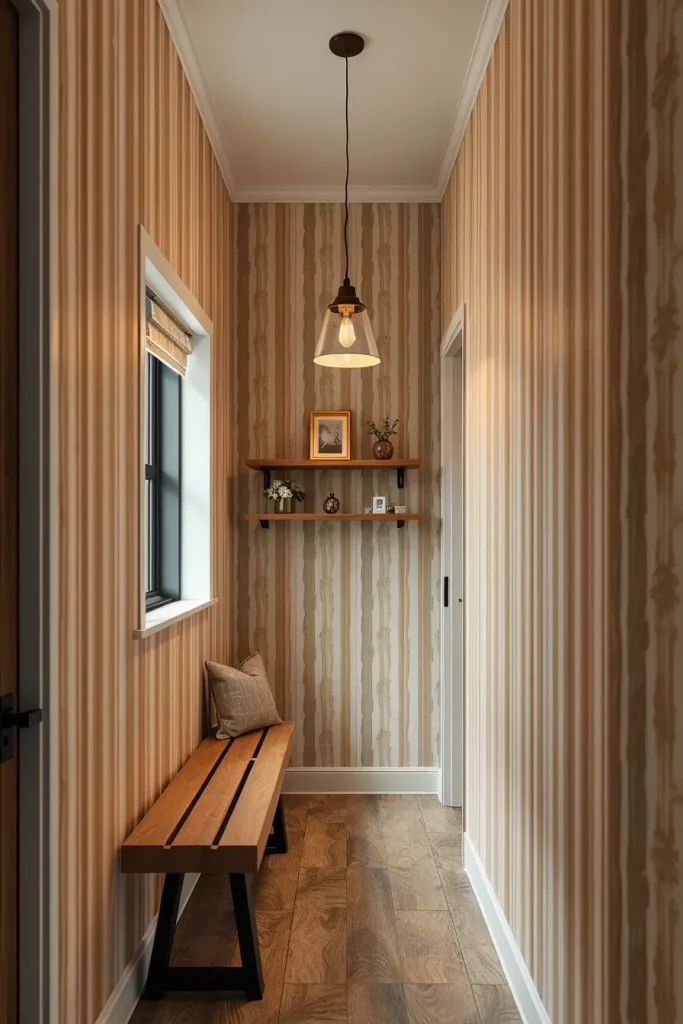 Using soft dove gray or beige striped wallpaper that goes from the floor to ceiling gives the best results. Wood strips in oak or ash inserted vertically can give your house an appealing and natural touch. Using a slender bench with a floating shelf helps you save floor area. When you can, put in a linear pendant light to add to the vertical motif.