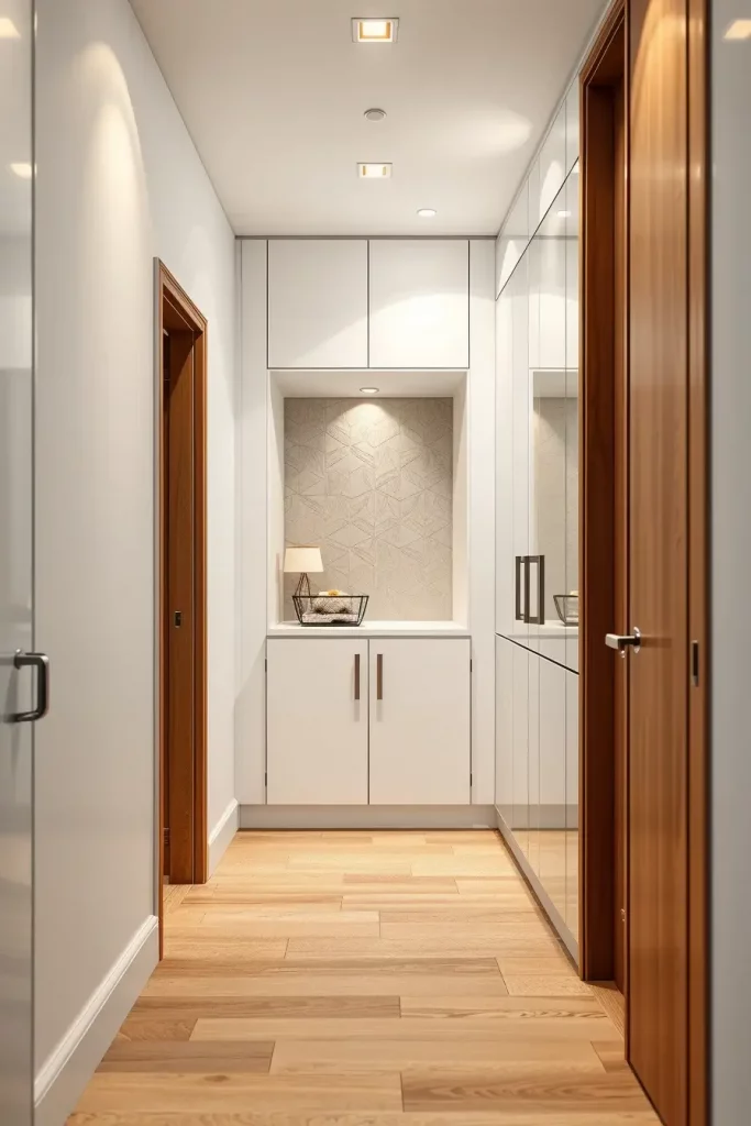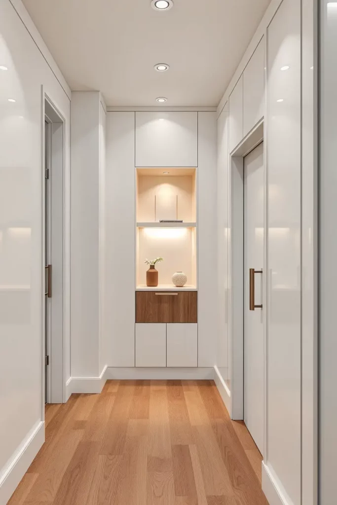 If you want to save space, in-wall storage is a wise idea for your small hallway. This way of organizing is worth recommending in places where-inch counts. By using custom millwork, it’s possible for the storage wall to blend seamlessly, so the hallway looks neat and tidy.
