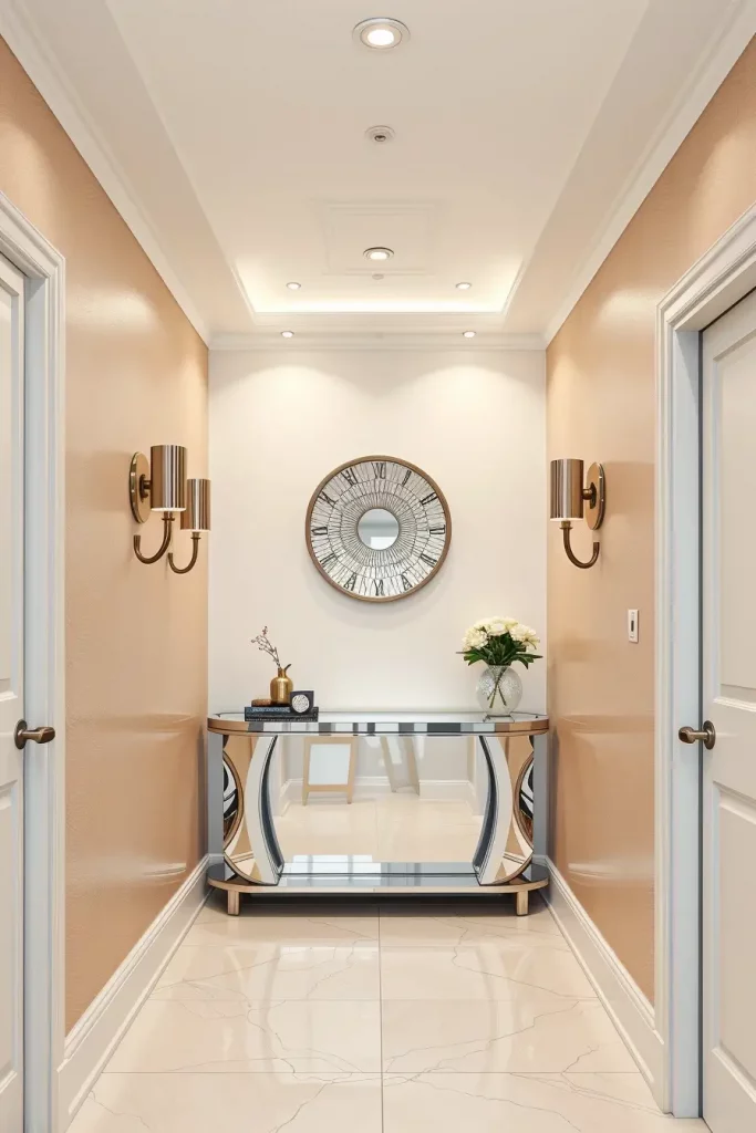 Using reflective materials is a simple way to give a hall a sense of space and light. You don’t need many reflective or colorful surfaces to lighten your room and create a feeling of space.