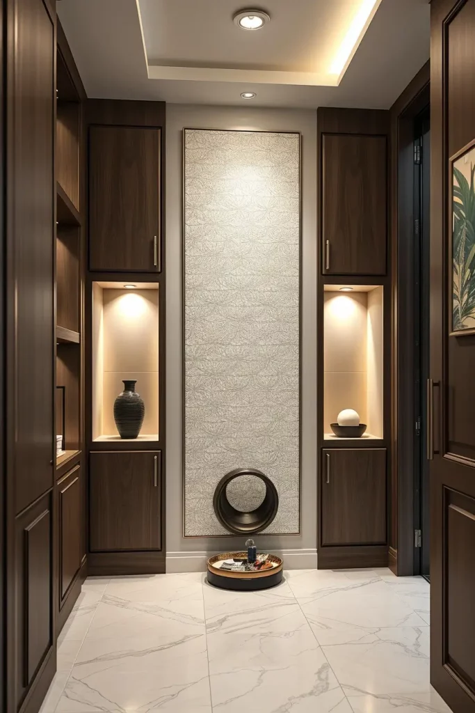 The first thing to do is make 4–6 inch deep niches at the same height as you or someone standing. Add tile, wood or wallpaper inside for a different look. Install strips or small puck lights inside every niche for just a little light. Place keys, a living plant or a sculpture on top of a small tray when designing a corner.