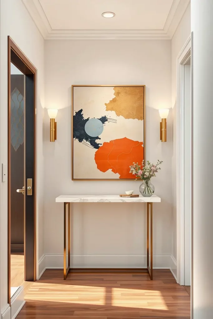 In my opinion, putting artwork at the end of a hallway lifts the energy of the whole space. We selected a soft color, abstract piece and hung it above a marble console as I redesigned the entry of a Manhattan home for a client. Using these items made the room feel classier, but I didn’t have to add big and heavy furniture. Get artwork that draws attention but fits well with the decor of the room.