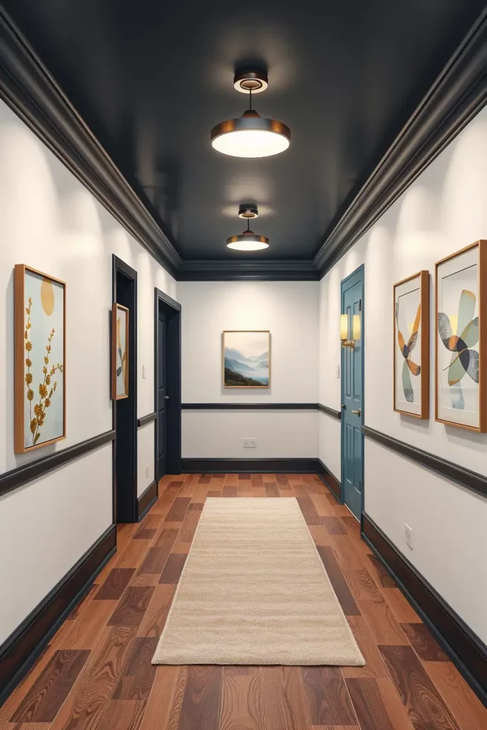 You can choose ceiling paint in many ways depending on the look you want in your home. A gorgeous suspended feature can be made using deep navy, muted charcoal or even terracotta. In tighter places, you should choose matte over gloss because it avoids glare. Minimalist pendant lights or recessed ceiling lights are a good match, so the new design doesn’t feel cluttered. You might also coordinate the colors of your art and runner with the ceiling to bring the space together.