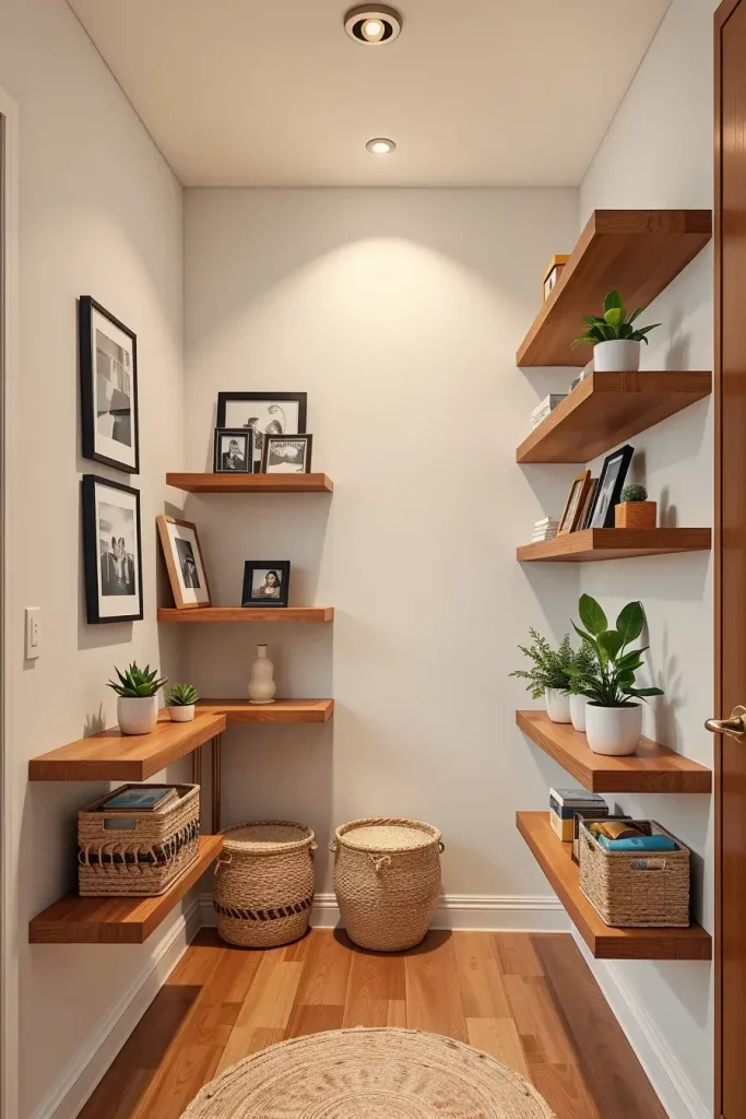 Most people don’t use the space at corners in narrow hallways, but I recommend filling these areas with well-designed storage shelves. Shelves placed wherever there’s space, floating or on the ground, are the right solution for using awkward areas and adding character to your décor. You can use corner shelves for decor and for storage.