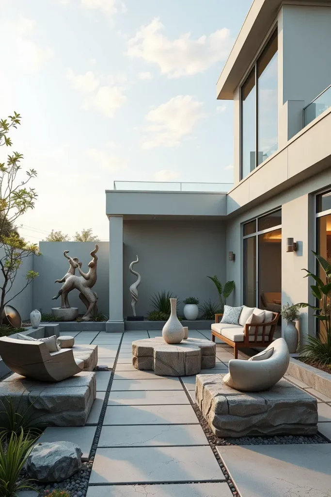 I often include large-scale stone sculptures, metal art installations, or abstract concrete forms placed deliberately within sightlines. These pieces are balanced with simple furniture, neutral surfaces, and controlled planting to avoid visual overload.