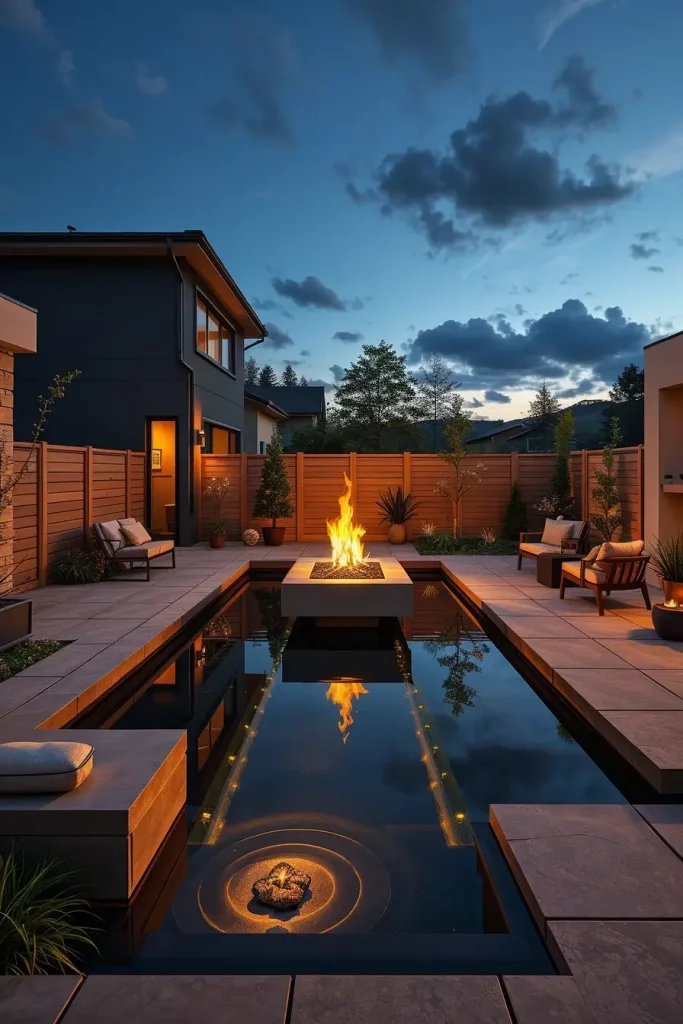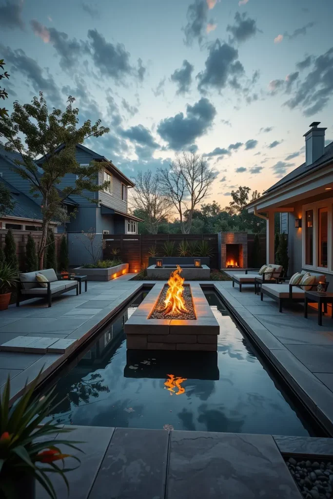 Combining fire and water is one of my favorite approaches for modern back patio design because it creates a dynamic yet balanced environment. These patios are carefully zoned, allowing fire features and water elements to coexist without overwhelming the space. Structurally, this combination works best in layouts with clear geometry and controlled symmetry.