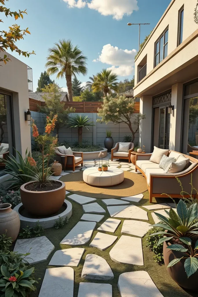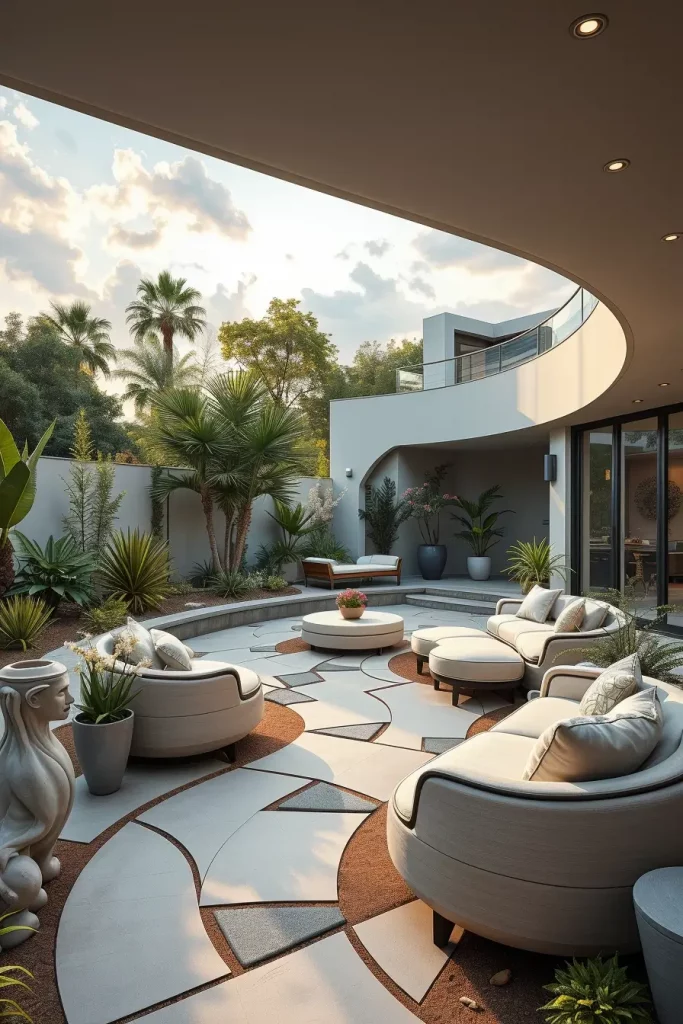 Furniture often includes rounded sofas, circular tables, and curved benches that echo the overall layout. Pathways, planters, and even water features follow similar shapes, reinforcing visual continuity. These choices help the patio feel cohesive while remaining highly functional.