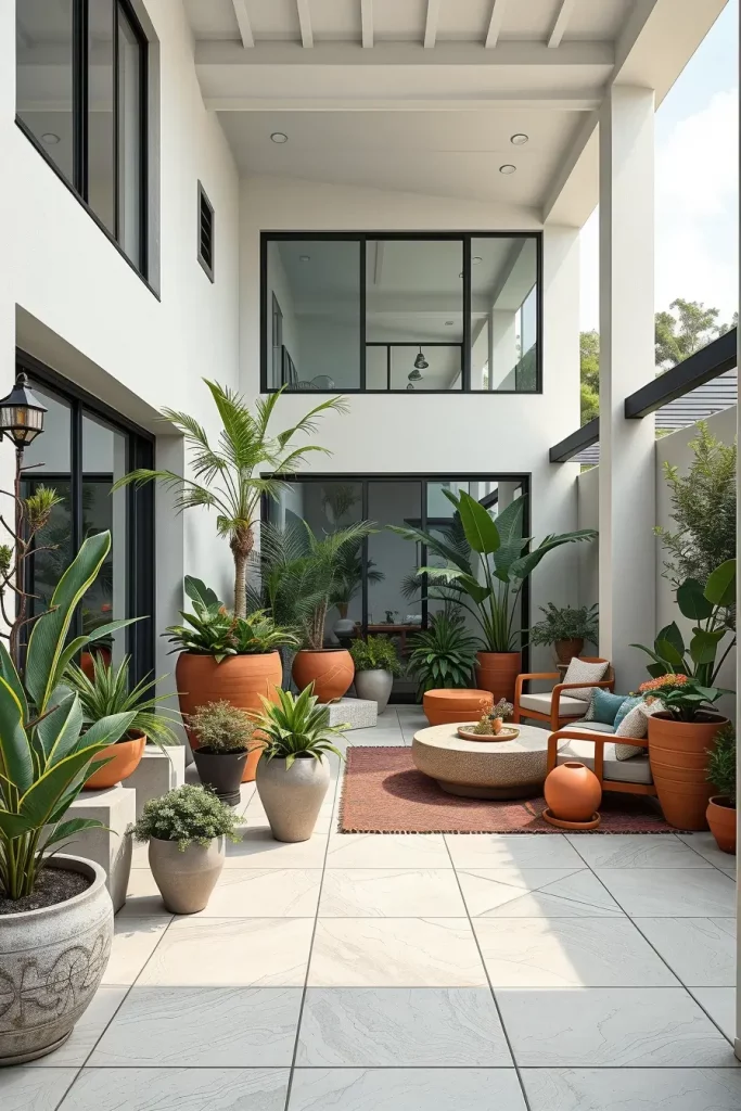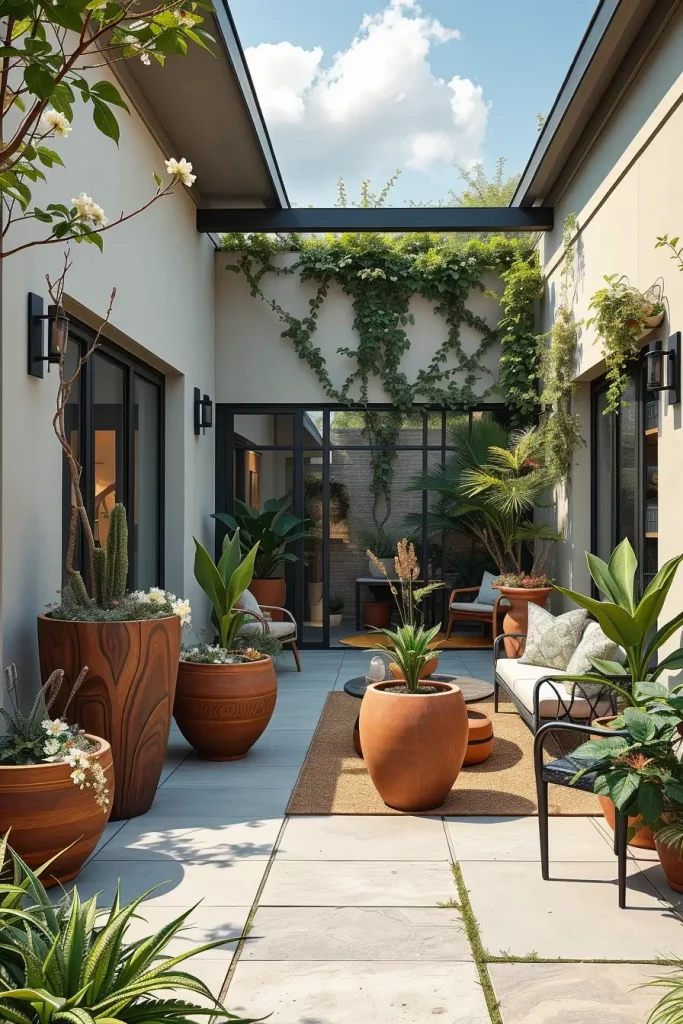 Back Patio Concepts Using Sculptural Planters And Artistic Greenery
