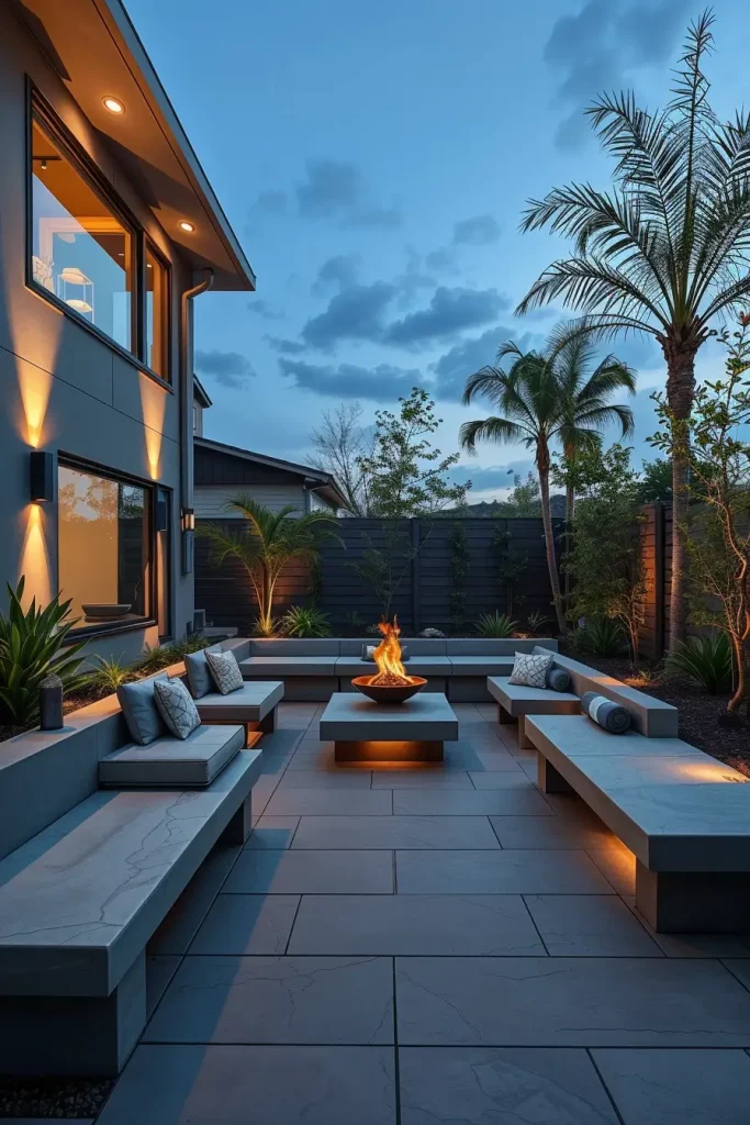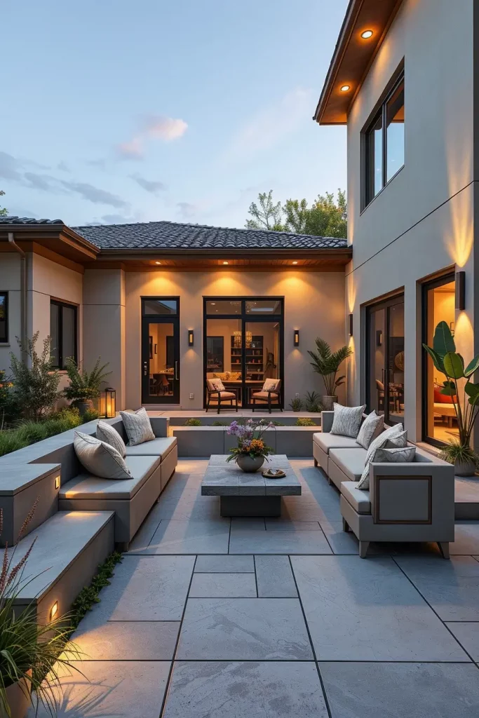 Integrated sculptural seating transforms the back patio into a functional art piece. I design these patios so seating is built into the architecture, reducing the need for excess furniture while creating a strong visual statement. This approach is especially effective for modern and stylish patios.