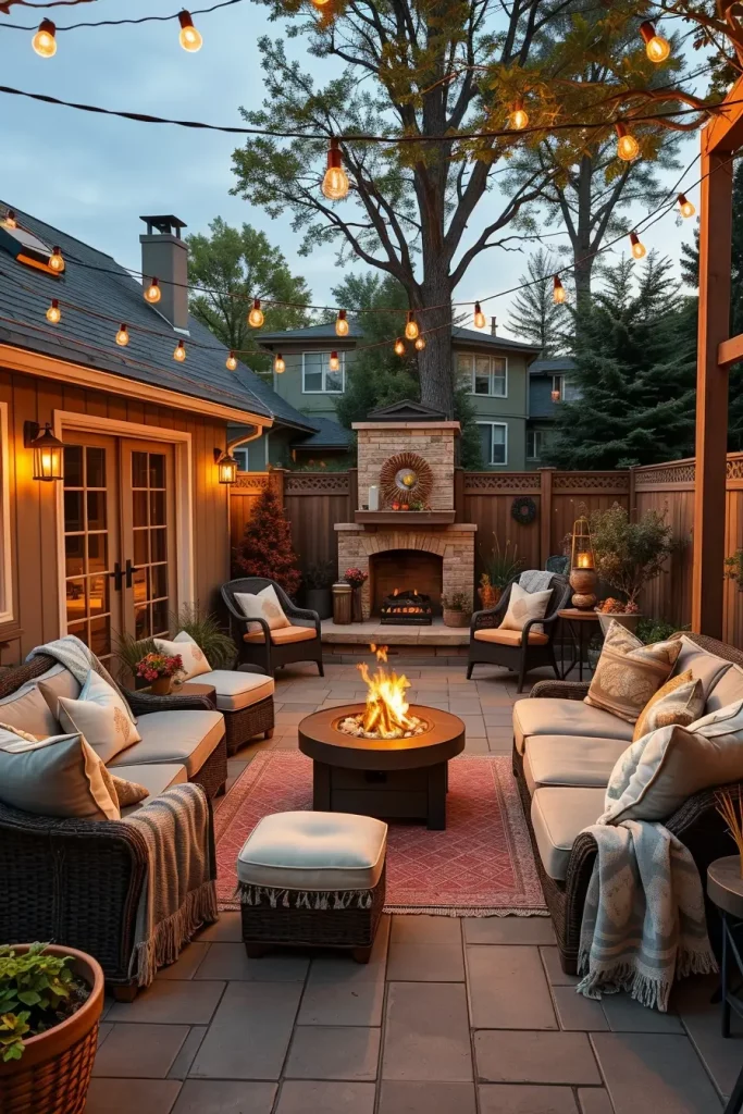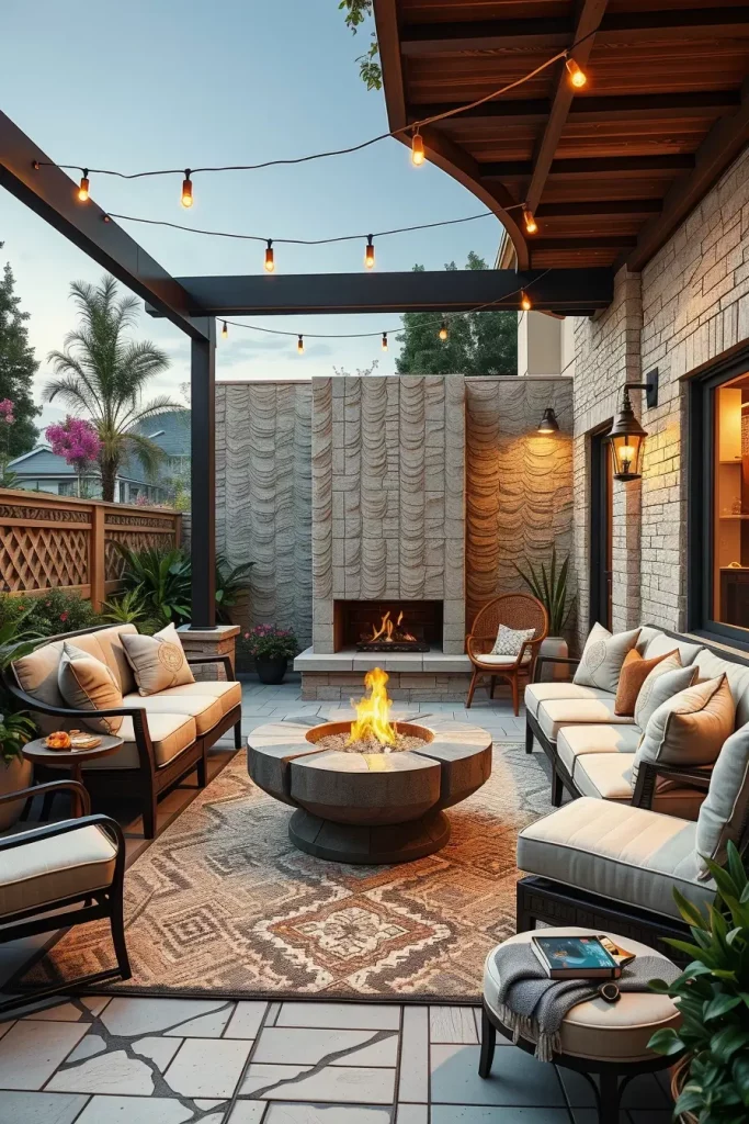To complete this type of patio, I would recommend adding layered lighting — combining ambient, task, and accent sources — to enhance both coziness and visual drama after dark.