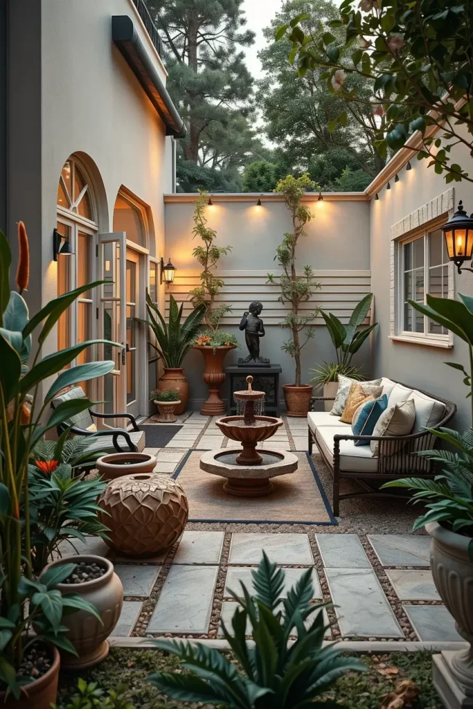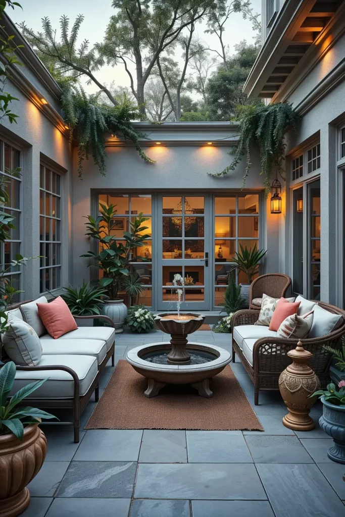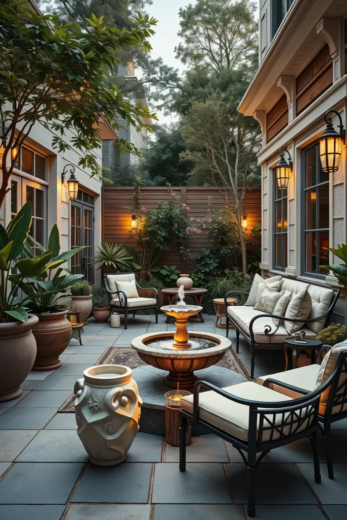 Stylish Back Patio Ideas With Small Fountains As Centerpieces