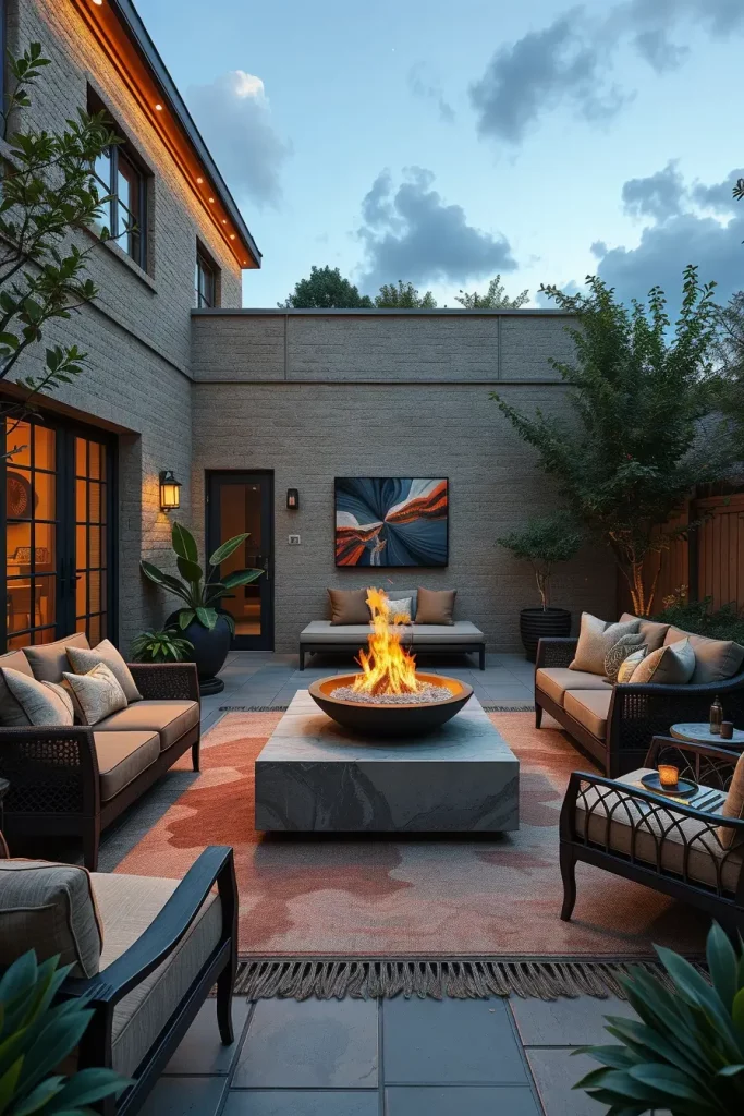 I typically pair linear fire pits or sculptural fire bowls with minimalist water features such as reflecting pools or narrow fountains. Seating is arranged to enjoy both elements simultaneously, often using modular sofas and swivel chairs that allow flexible viewing angles. Durable materials like concrete, metal, and stone ensure long-term performance.