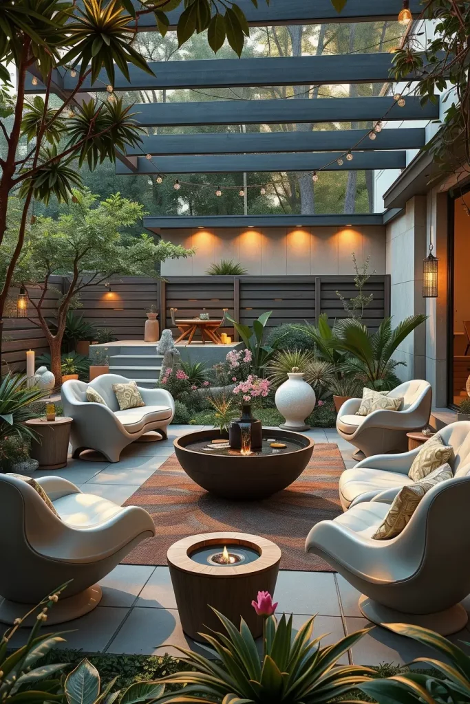 I incorporate lounge chairs, small fountains, sculptural planters, and carefully chosen greenery that frames the seating rather than overwhelming it. Lighting is soft and indirect, reinforcing the sense of privacy and escape.