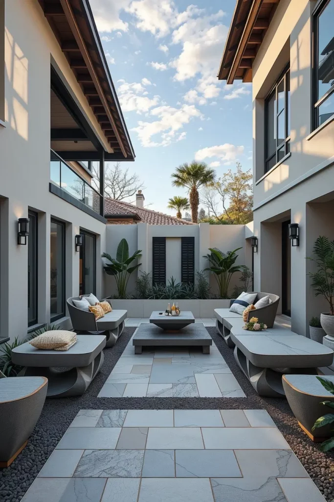 Typical materials include textured stone, ribbed concrete, wood accents, and woven outdoor textiles. Furniture remains streamlined, allowing surfaces to take visual priority while maintaining comfort and usability.