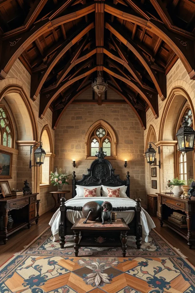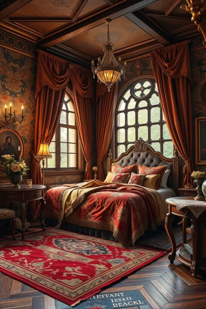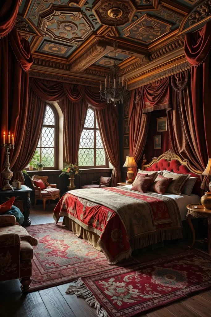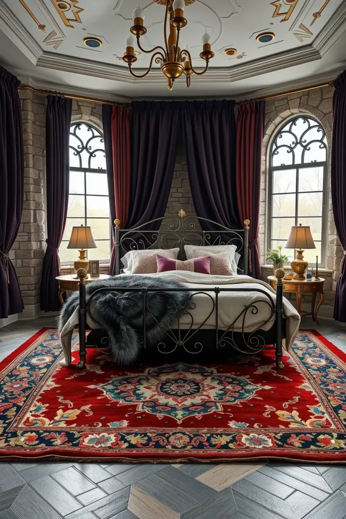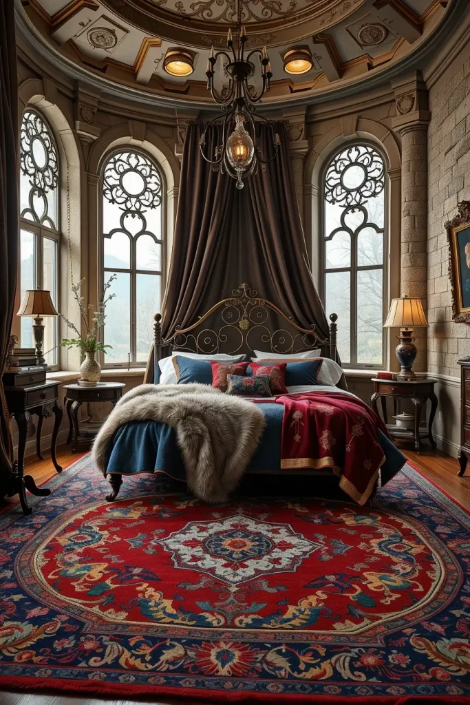 The flooring is usually the first thing that creates a tone when I enter a bedroom. The rugs and floor coverings play a critical role in Castlecore design because they add warmth and texture to rooms that otherwise would be cold. Both heavy, richly decorated carpets in a medieval design or Persian-style motifs not only floor the room but also offer a comfortable, cozy surface to the feet.