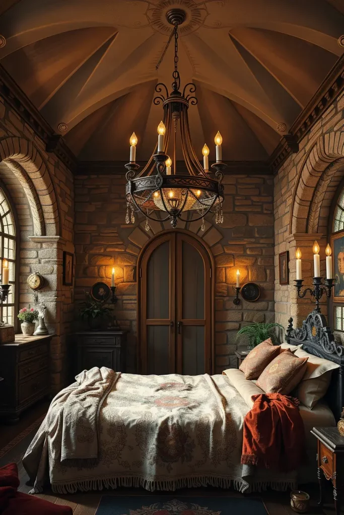 The atmosphere is determined by lighting, and wrought iron moody fixtures are a must in Castlecore bedrooms. Chandeliers, wall sconces, and ceiling lights made of this material give a medieval atmosphere but are very useful. Their dark and complex designs are in contrast to the light candle light and shining fabrics.