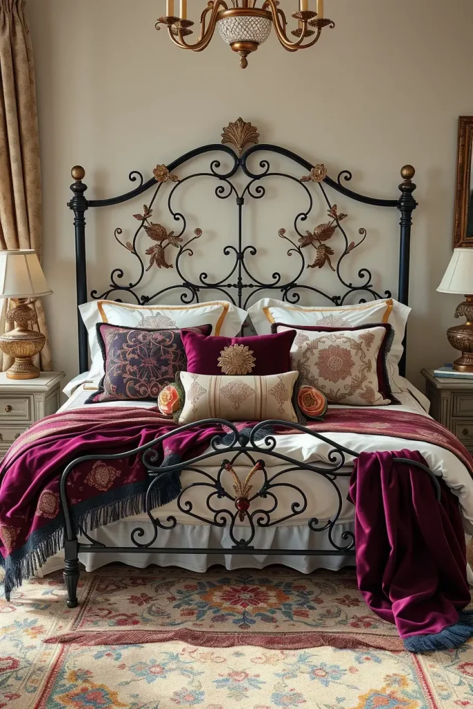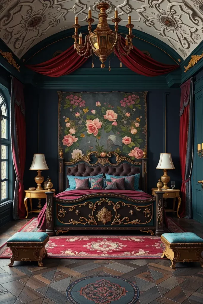 I tend to ground the design with heavy curtains, fancy bedding, and soft carpets. The inclusion of throw blankets and cushions with embroidered designs completes the whole picture and makes the room look elegant and practical.