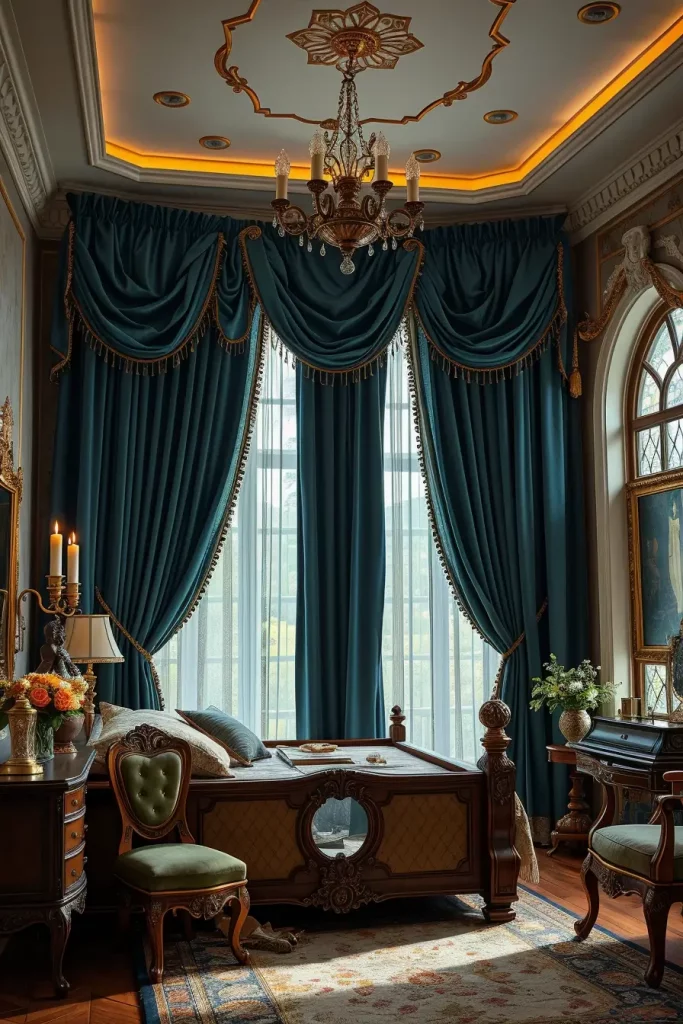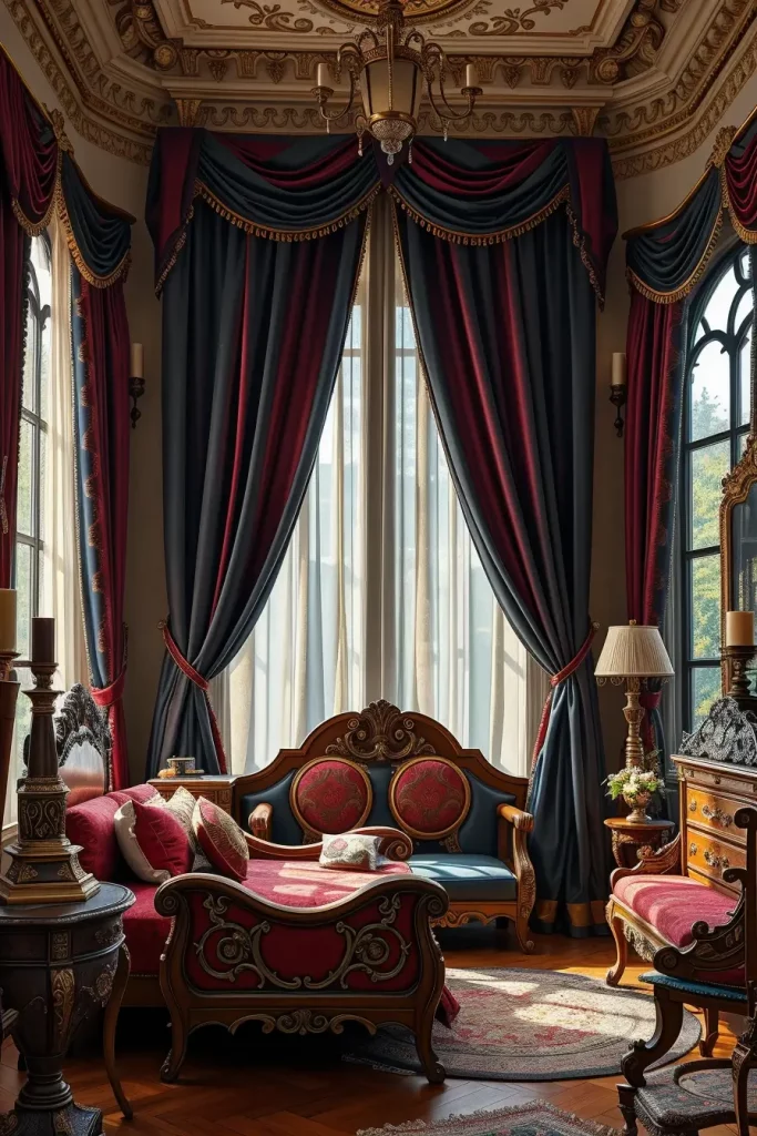 What I would include to finish this section is the overlaying of sheer curtains under the velvet. This permits natural daylight in the daytime and still maintains the royal ambience in the night.