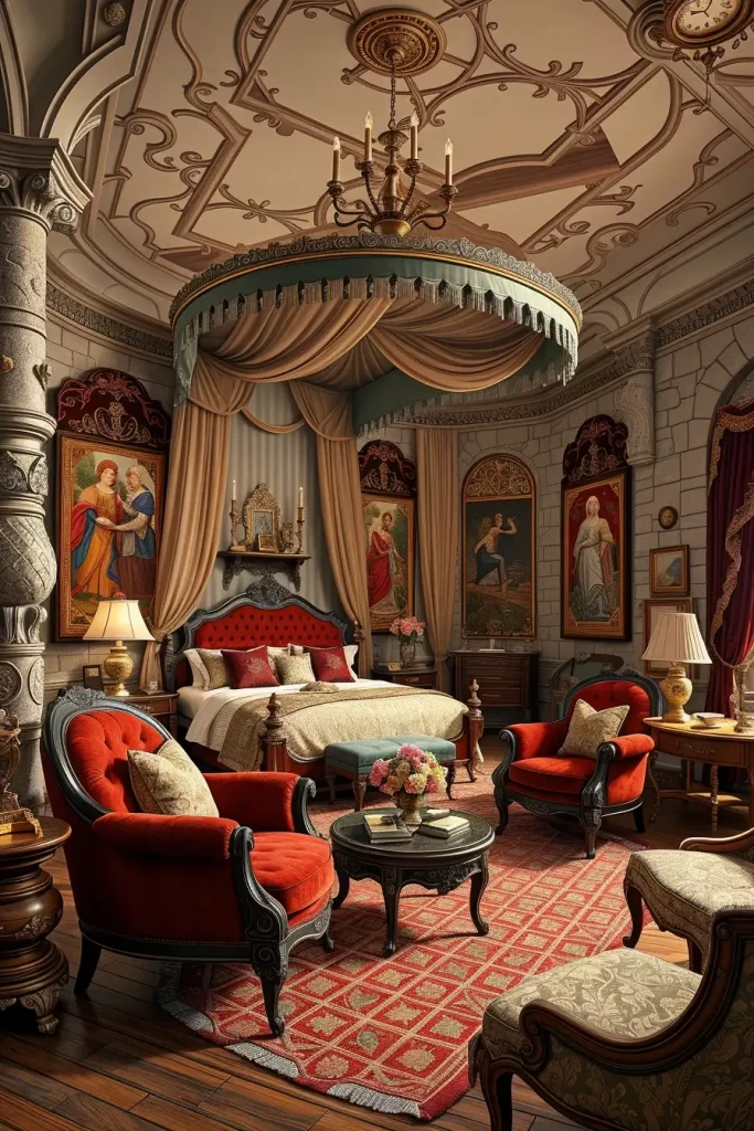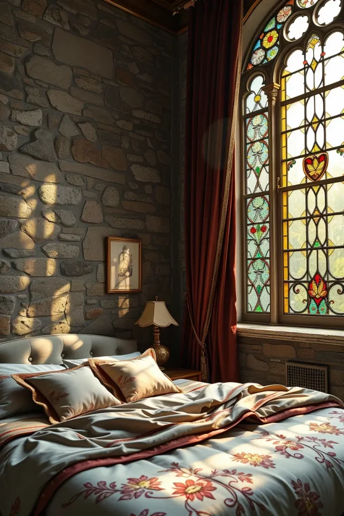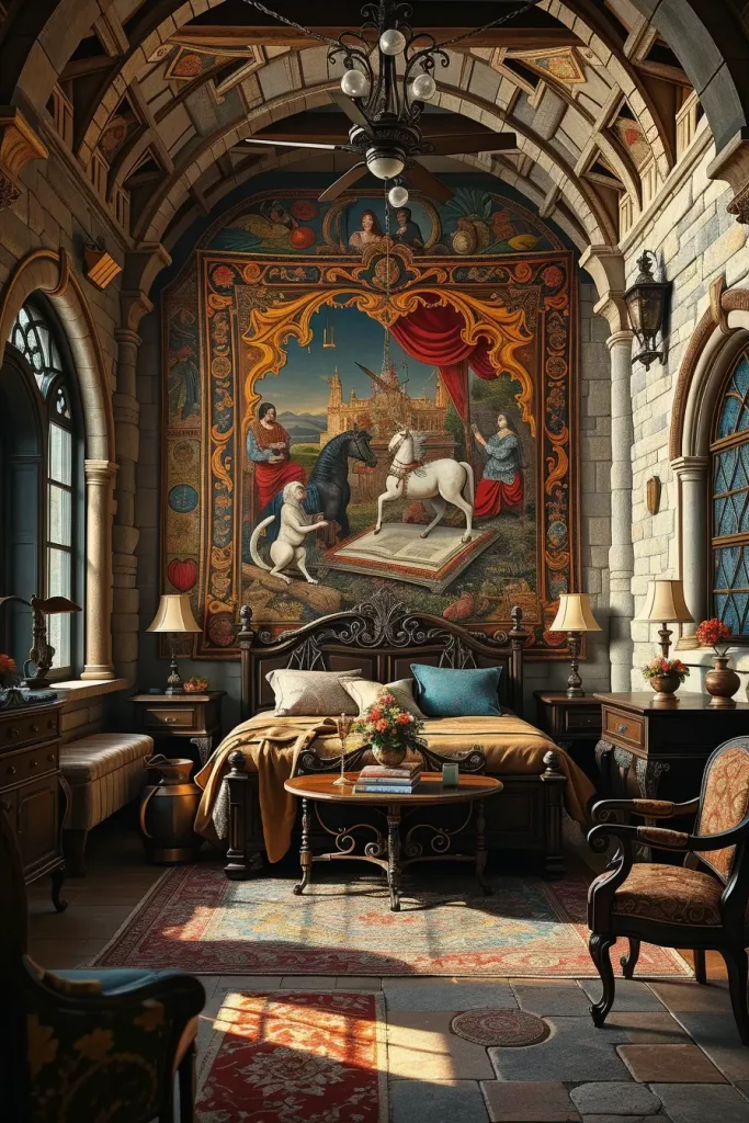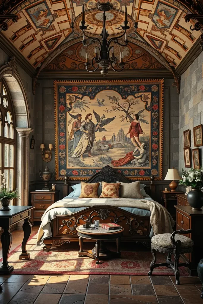 One of the most powerful symbols of the castle bedroom design is tapestries. The space immediately acquires a historical quality when I add them. They serve as art and insulation, which is a sensible benefit in colder climates that castles were originally meant to provide.