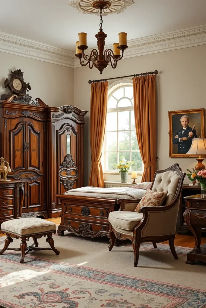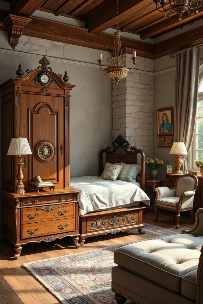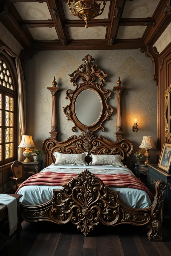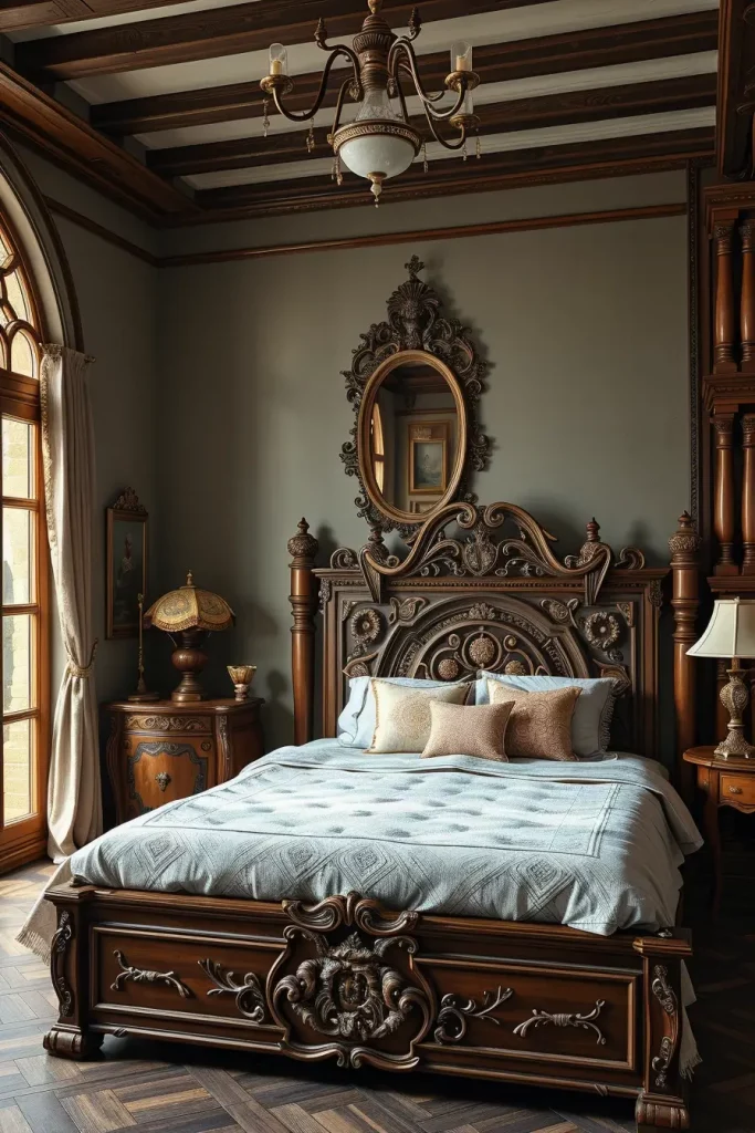 I prefer to use carved bedposts, floral motifs on the drawers of the dresser, or ornamental wooden panels on the walls. These details support the feeling of history and provide the design with a sense of touch.