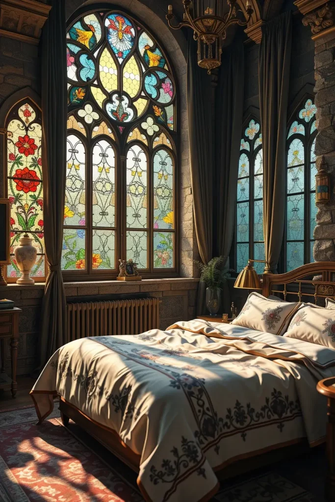 Personally, I have found stained glass panels installed in bedrooms to be very calming, particularly in early mornings or sunsets when the natural light is the most gentle. The use of stained glass to transform plain interiors into artworks has also been mentioned by designers at Architectural Digest. I support this design since it is neither too historical nor too livable.
