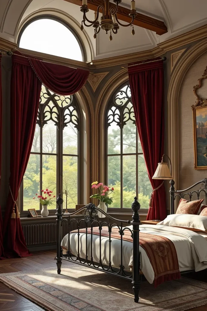 Arched windows are also one of my favorite features in Castlecore bedrooms, and they immediately give a space a medieval look. Although a room may not naturally have them, they can be creatively replicated by using window frames or wall treatments. They change the light and the atmosphere of the bedroom when combined with heavy drapes.