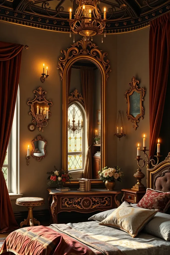 Mirrors can be used to decorate Castlecore bedrooms beautifully and bring light in the room. A framed gilded frame can be in gold, bronze or silver colors, and it reflects the light and adds opulence to the space. Mirrors also create the illusion of a larger bedroom which is a convenient benefit.