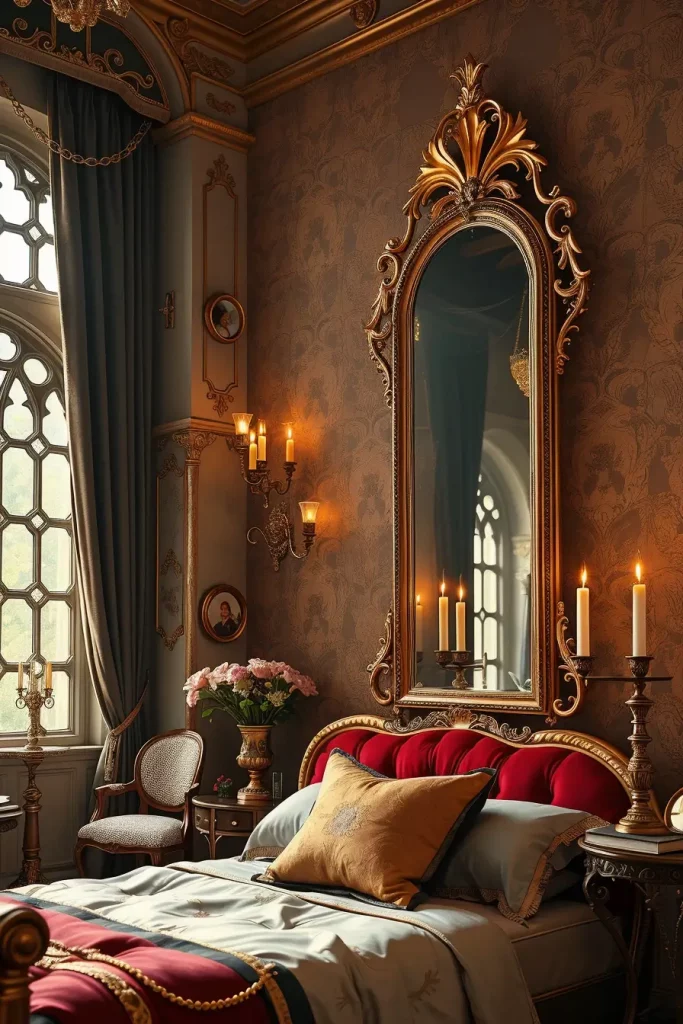 What I would add here would be two little gilded mirrors to serve as bedside decorations. They harmonize the room and support the symmetry but do not break the castle-inspired appearance.
