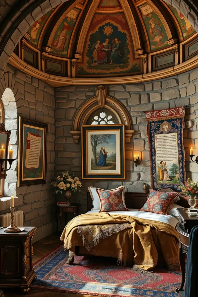 I think that one of the most expressive methods of supporting the Castlecore aesthetic in a bedroom is artwork. The space is given historical depth and storytelling through medieval-inspired wall art like tapestries, illuminated manuscript prints, or paintings of knights and castles. Hanging walls at large scale, especially, give the impression of grandeur and turn bare walls into narrative backgrounds.