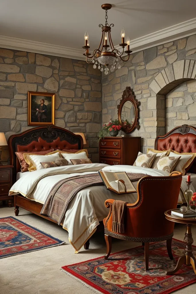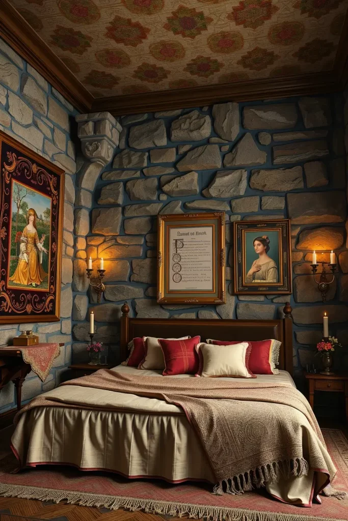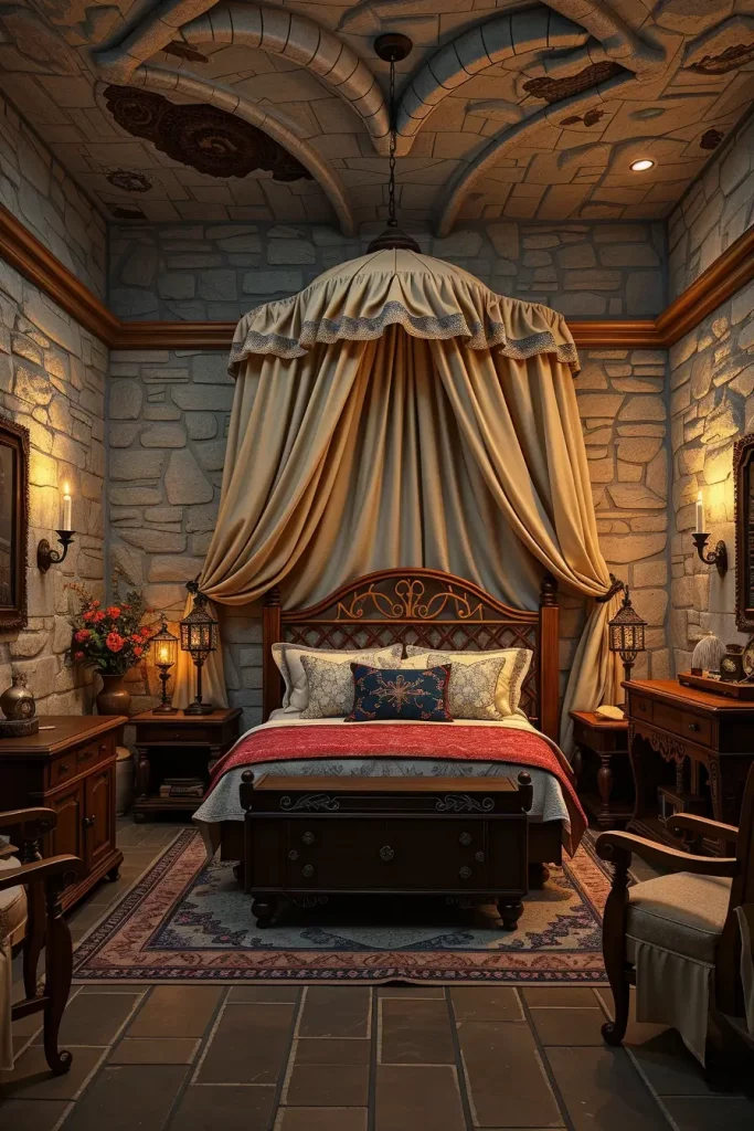 In my case, the atmosphere can be created by the background of a room, and stone-like walls are the best way to make it look like a castle bedroom. These may be actual stone accents, faux finishes or even stone patterned wallpaper. They give this royal ambience that is grounding and real.