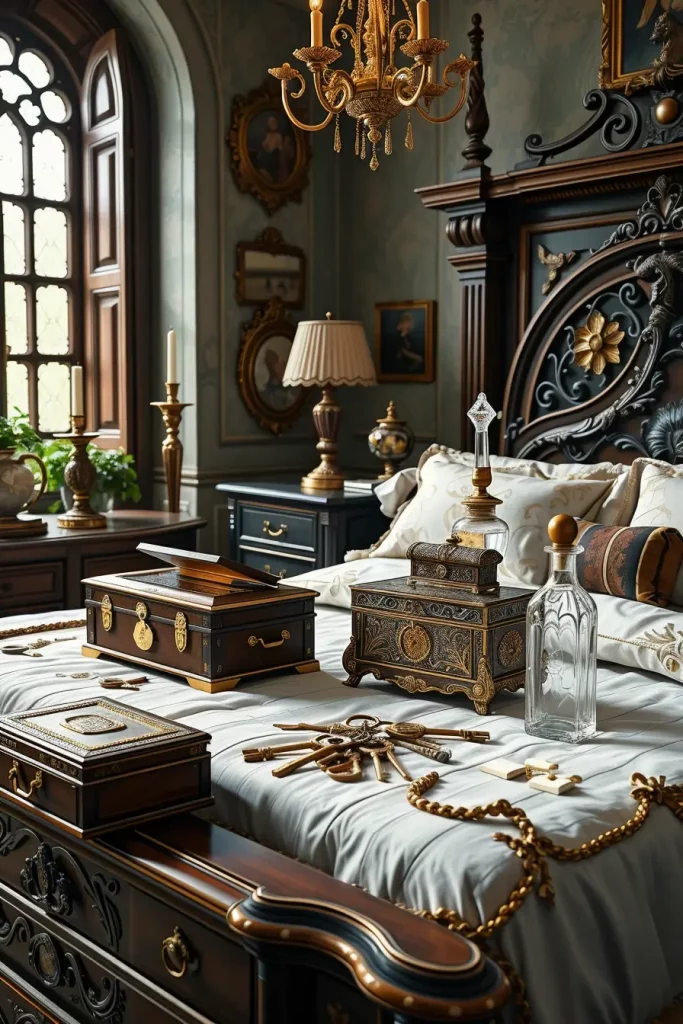 What adds soul to a Castlecore bedroom are accessories and trinkets. I would always recommend that you use minor details, like antique keys, miniature chests, or fancy jewelry boxes, to create the authenticity. These accents create an impression of history and personal treasures that have been passed through time.