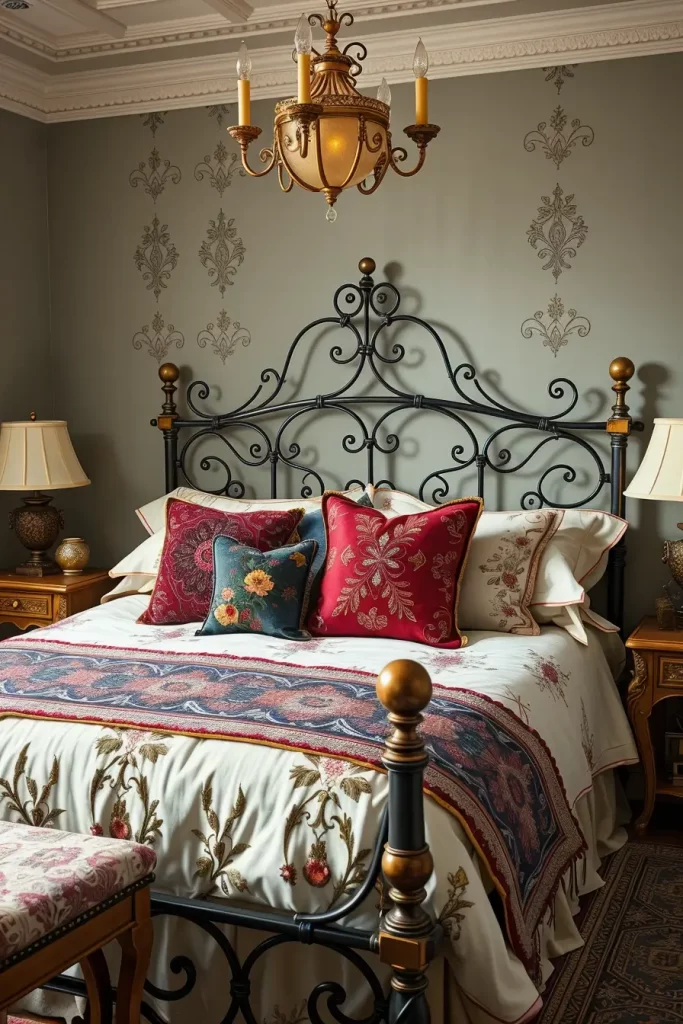 I prefer iron bed frames with old hardware, including wrought iron or brass drawer pulls or handles. These minor details resonate with the nature of the bed and form a unified style throughout the room. The regal effect is increased by placing the bed against a stone-textured or tapestry-covered wall.